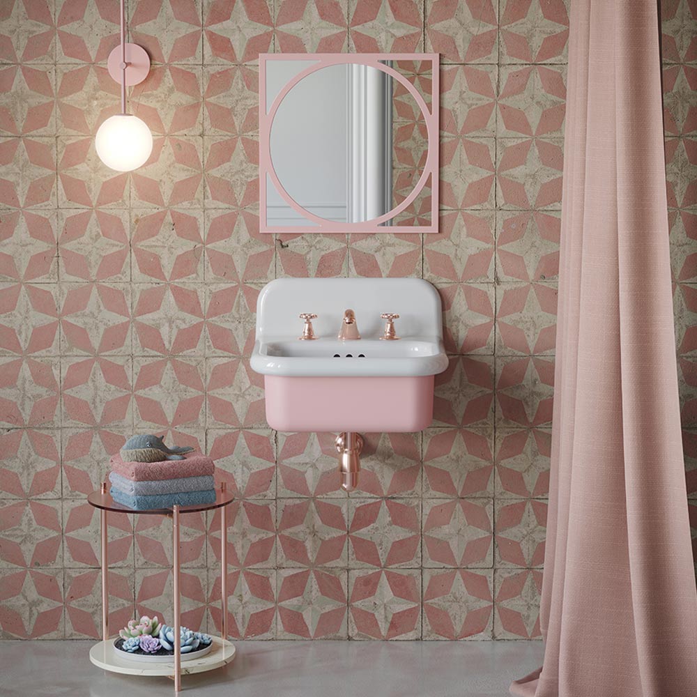 Godisrosa och vitt keramiskt tvättställ