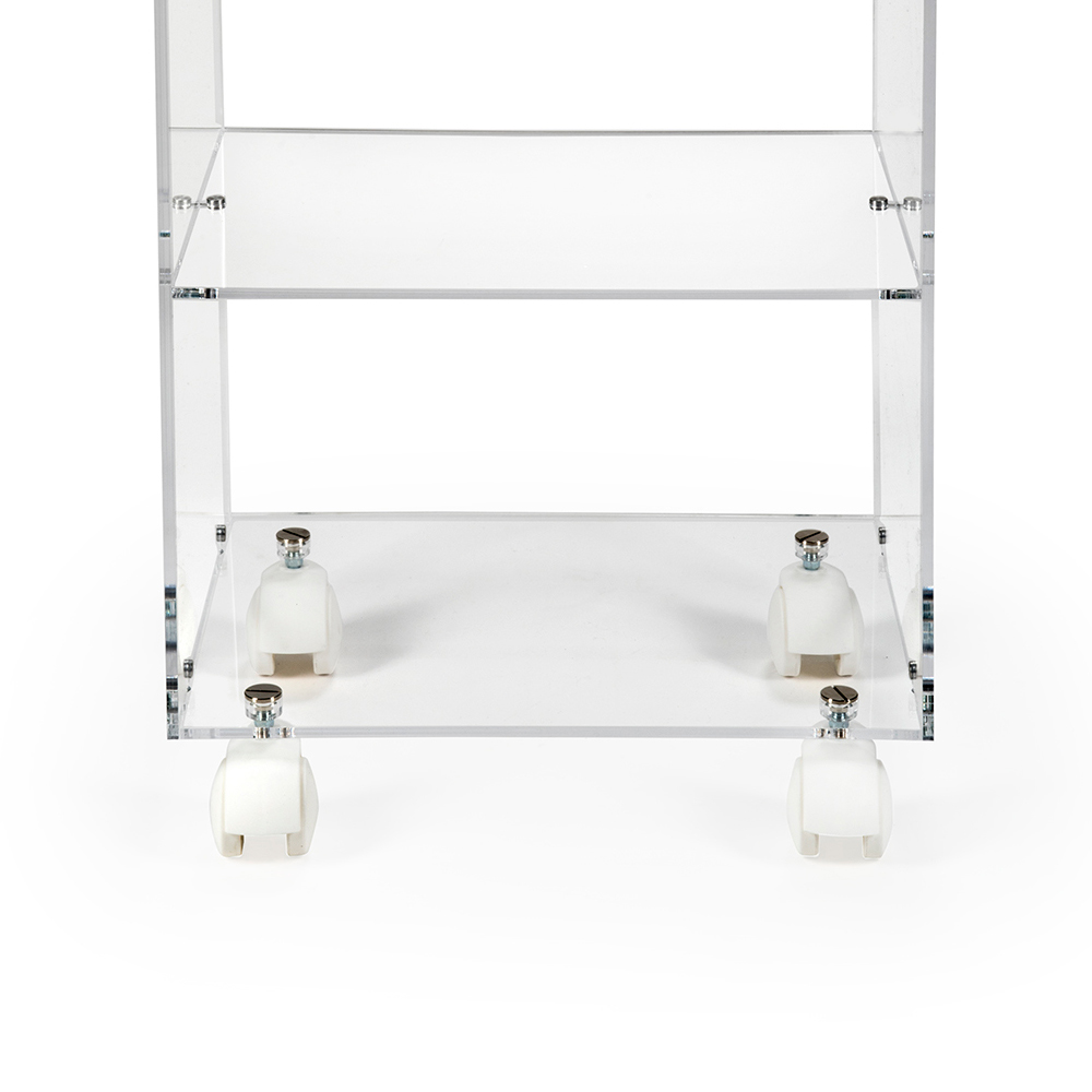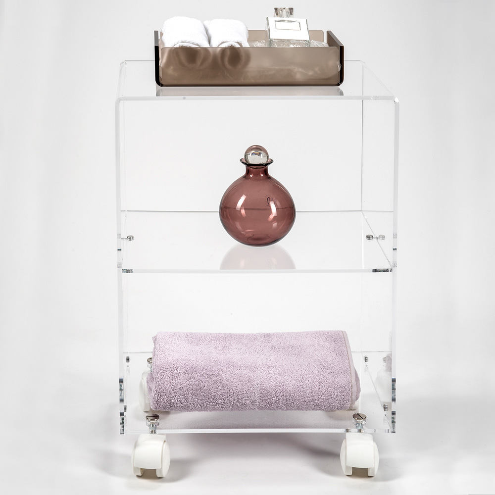 Varje hylla i denna vagn är en scen som förhöjer vad den innehåller, tack vare den kristallina transparensen hos förstahandsplexiglaset. Råmaterialet, 100 % jungfruligt polymerplexiglas , säkerställer en ljusstyrka och briljans som förblir oförändrad över tiden, ett engagemang för kvalitet som kan ses och kännas.