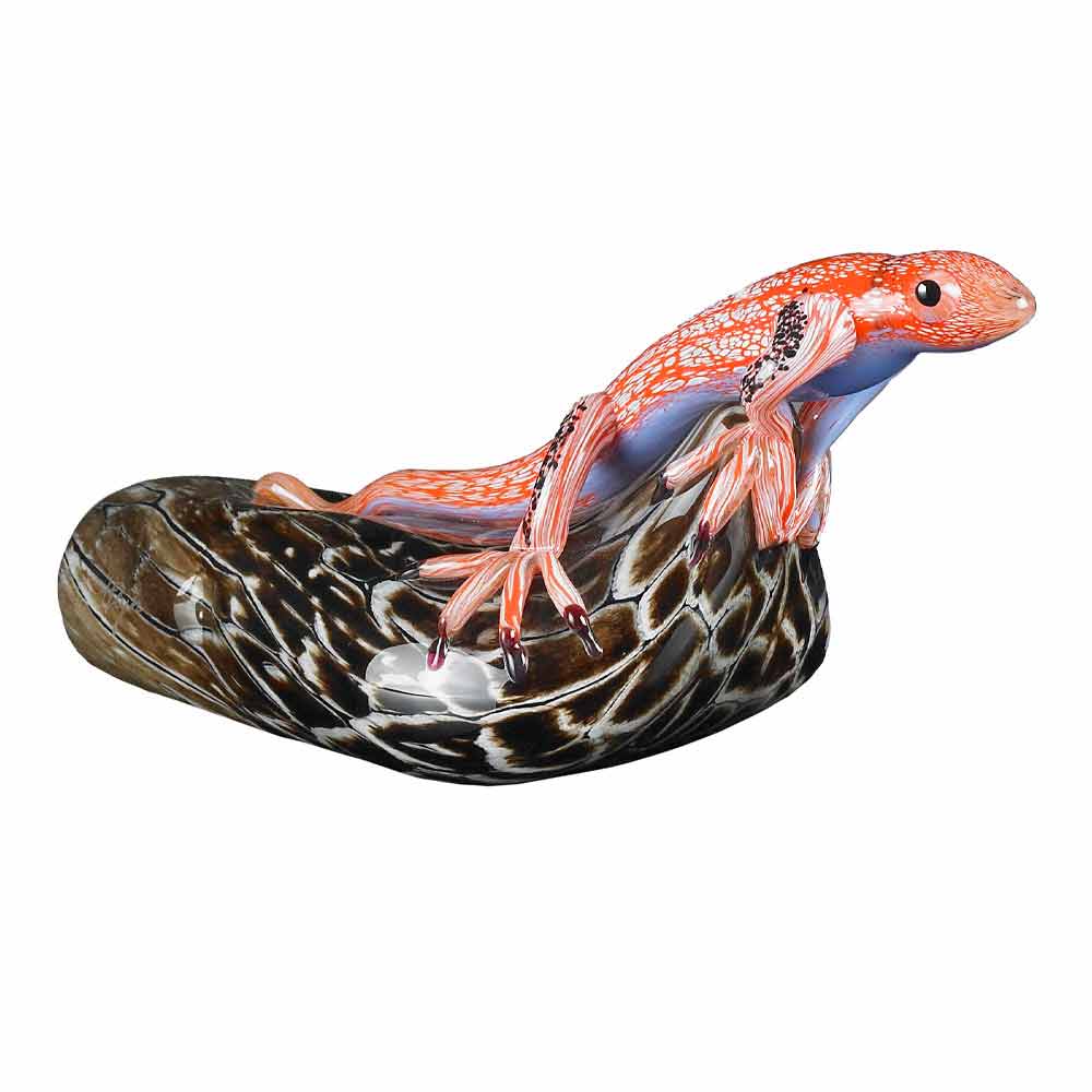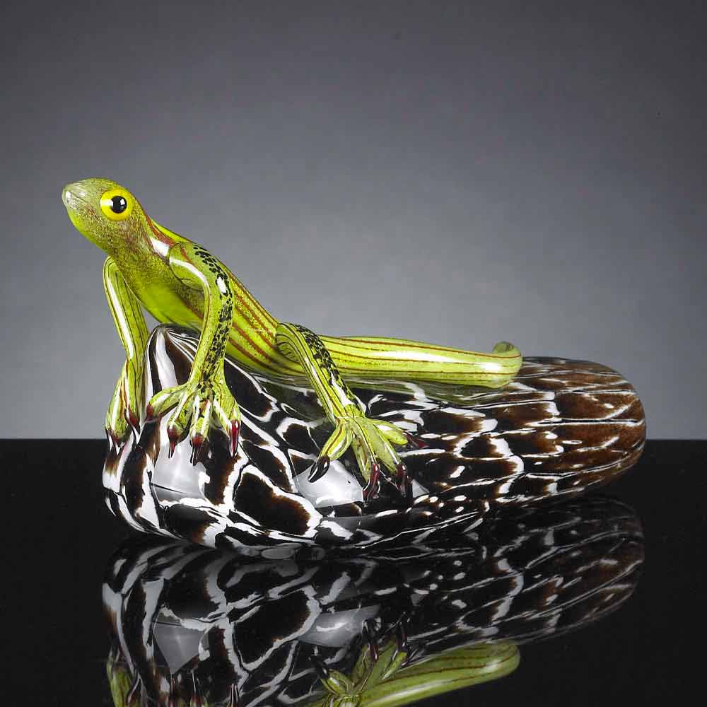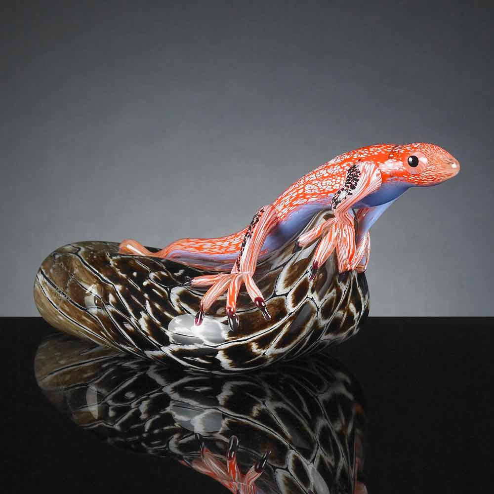 Prydnad i form av en ödla på en sten i färgat glas Tillverkad i Italien, fin.
