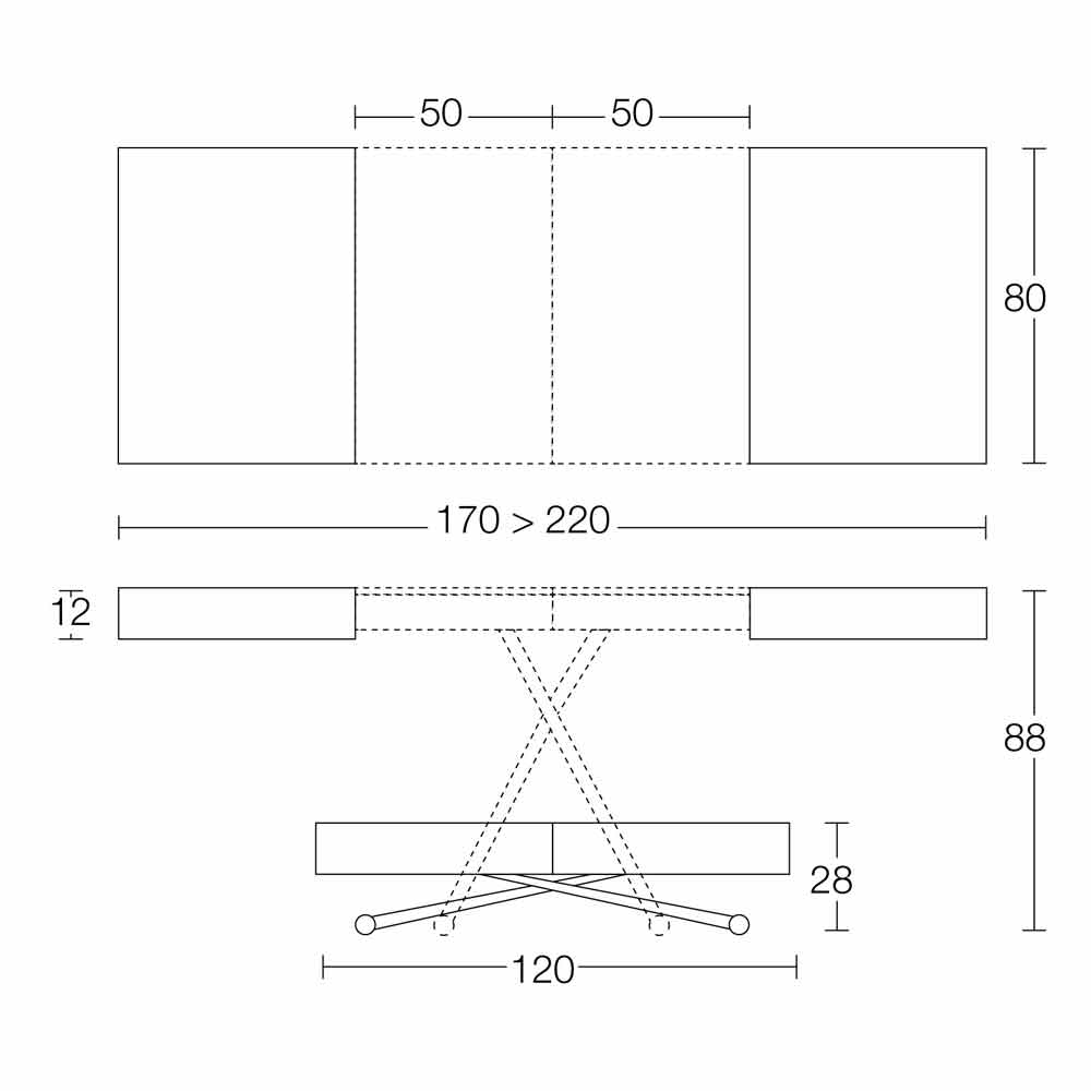 Toppen är rektangulär och utdragbar genom 2 invändiga förlängningar på 50 cm vardera.
