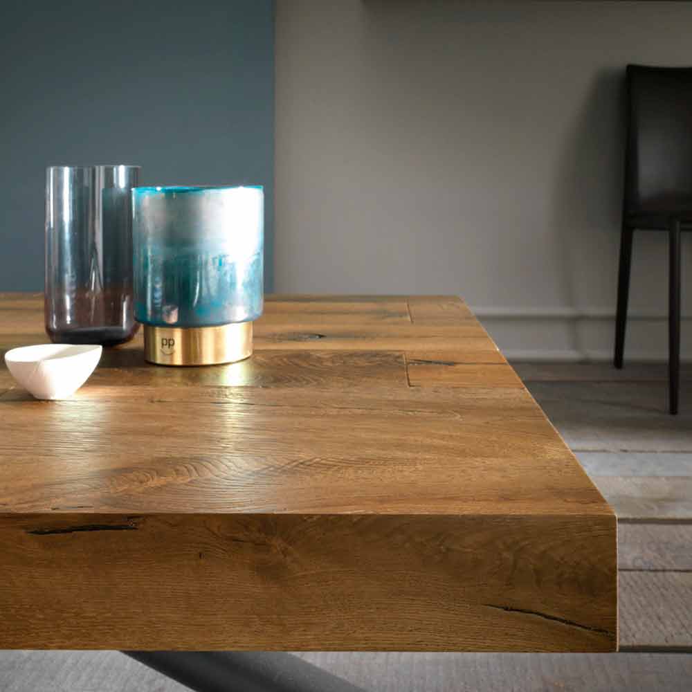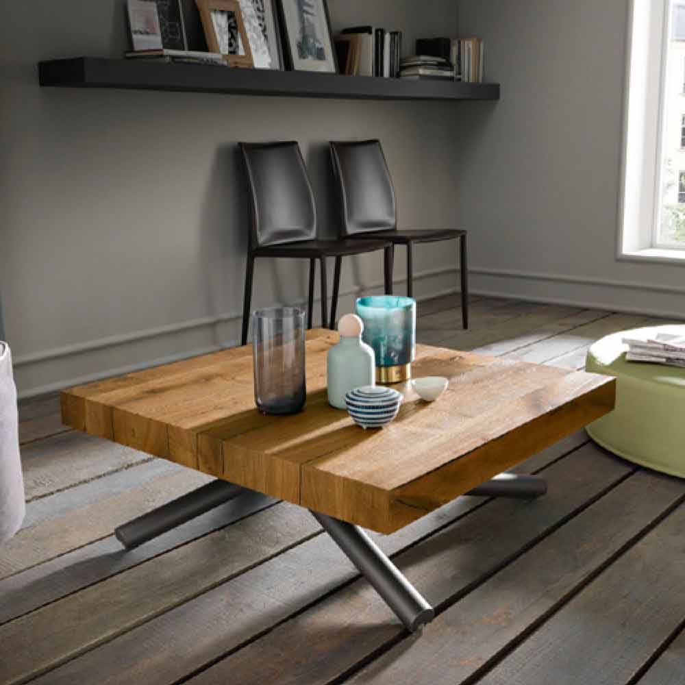 transformerbara soffbord förenar konceptets modernitet och metallbenens sammanflätade design, med den mest naturalistiska och värdefulla delen av den tjocka skivan (8 cm) i massiv ek.