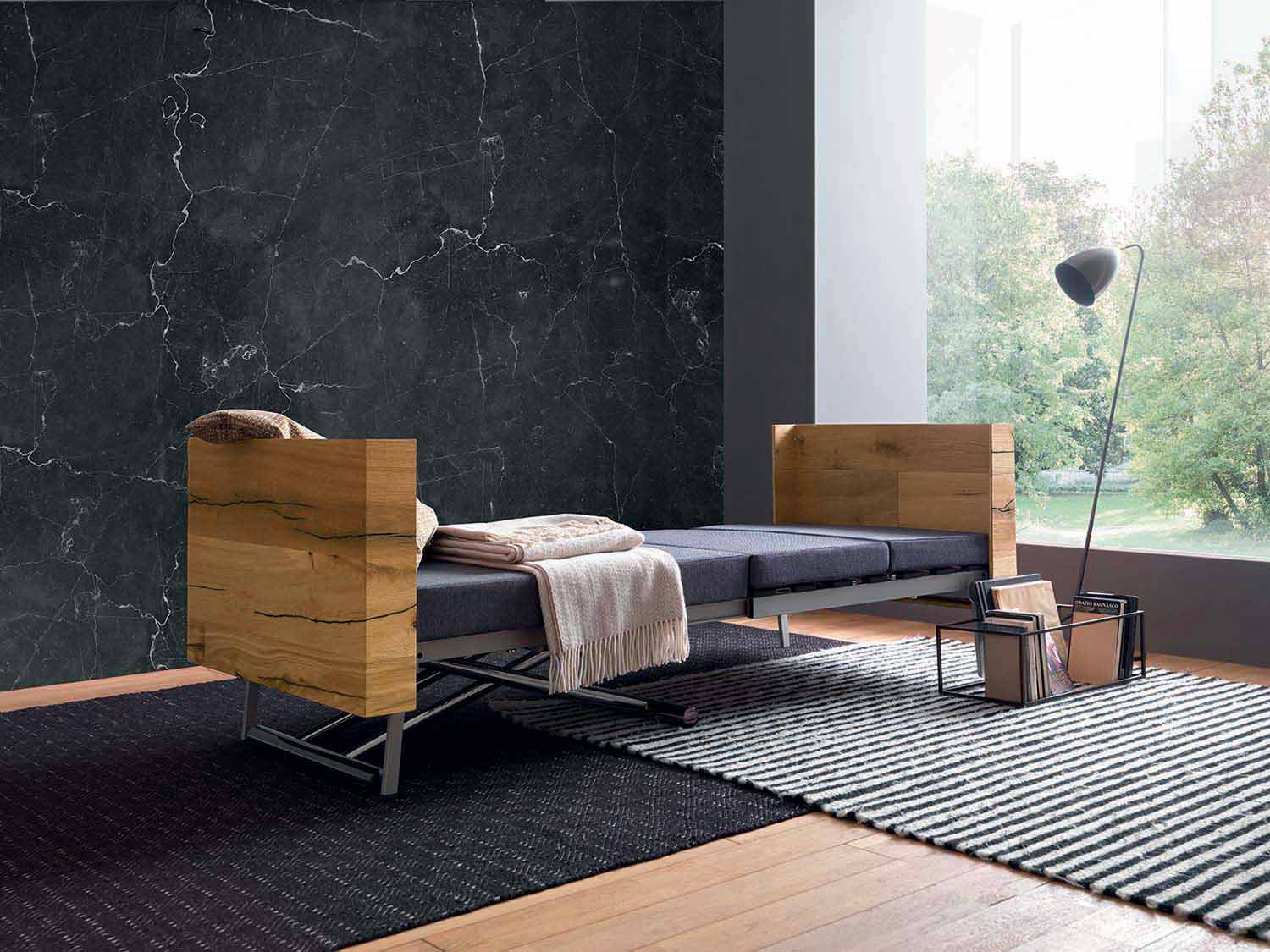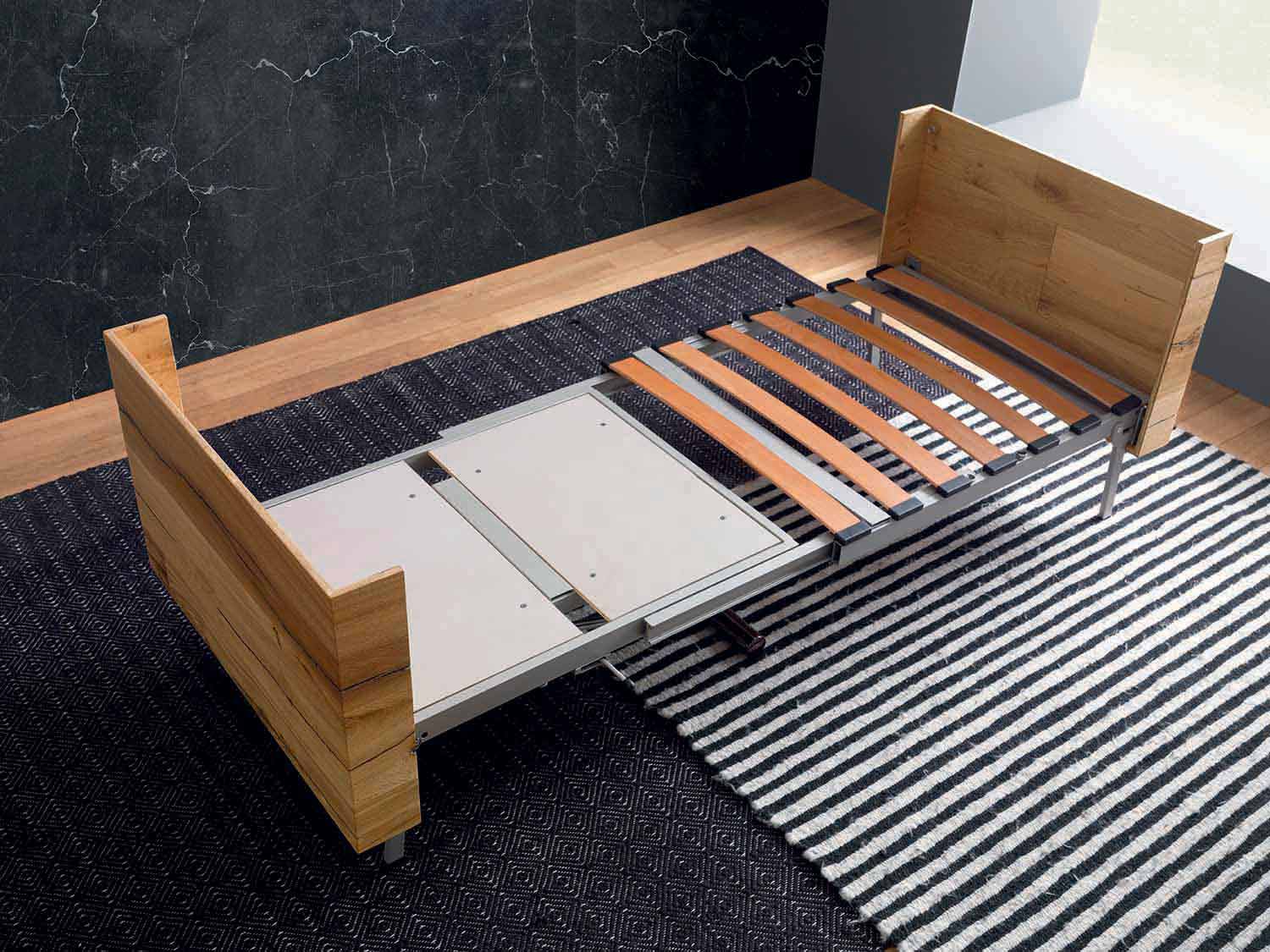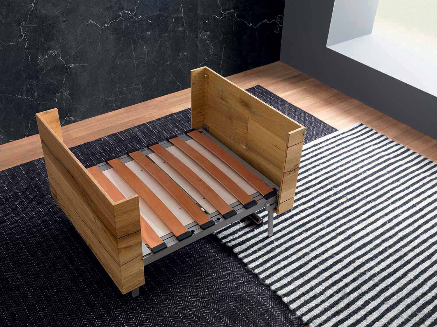 Utrustad med puff som kan göras om till en madrass (D 35 brandsäkert polyuretanskum), klädd i grått tyg. Lamellbotten och plywoodpanel. Fällbara stödben. Tavoletto