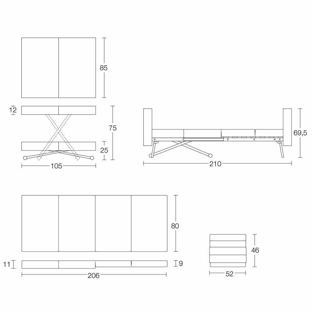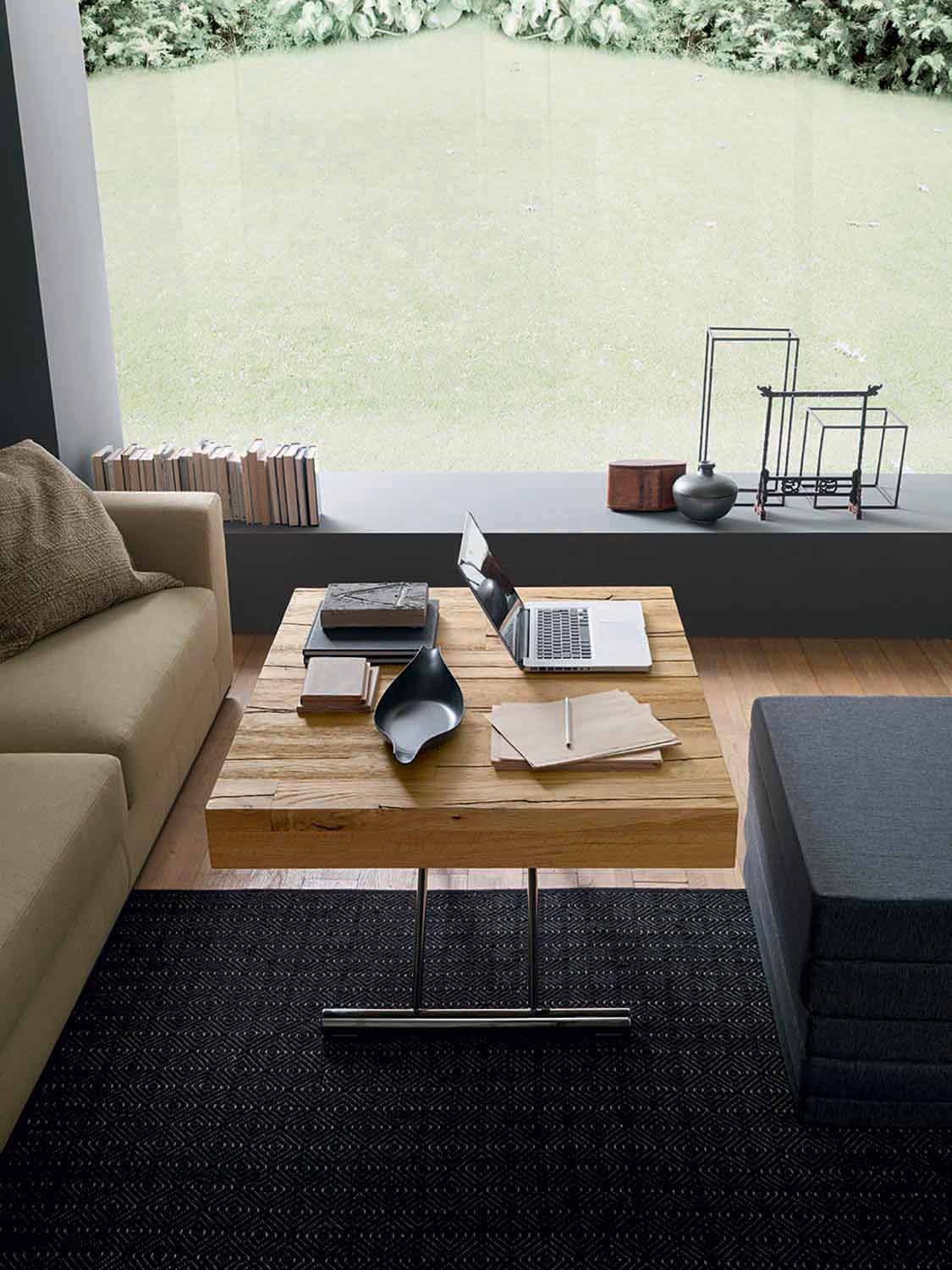 transformerbara soffbord kännetecknas av eleganta och mångsidiga linjer som kan röra sig i höjdled för att uppfylla funktionen av ett matbord som, om nödvändigt, utvecklas och ger form till en bekväm säng med raffinerad design.