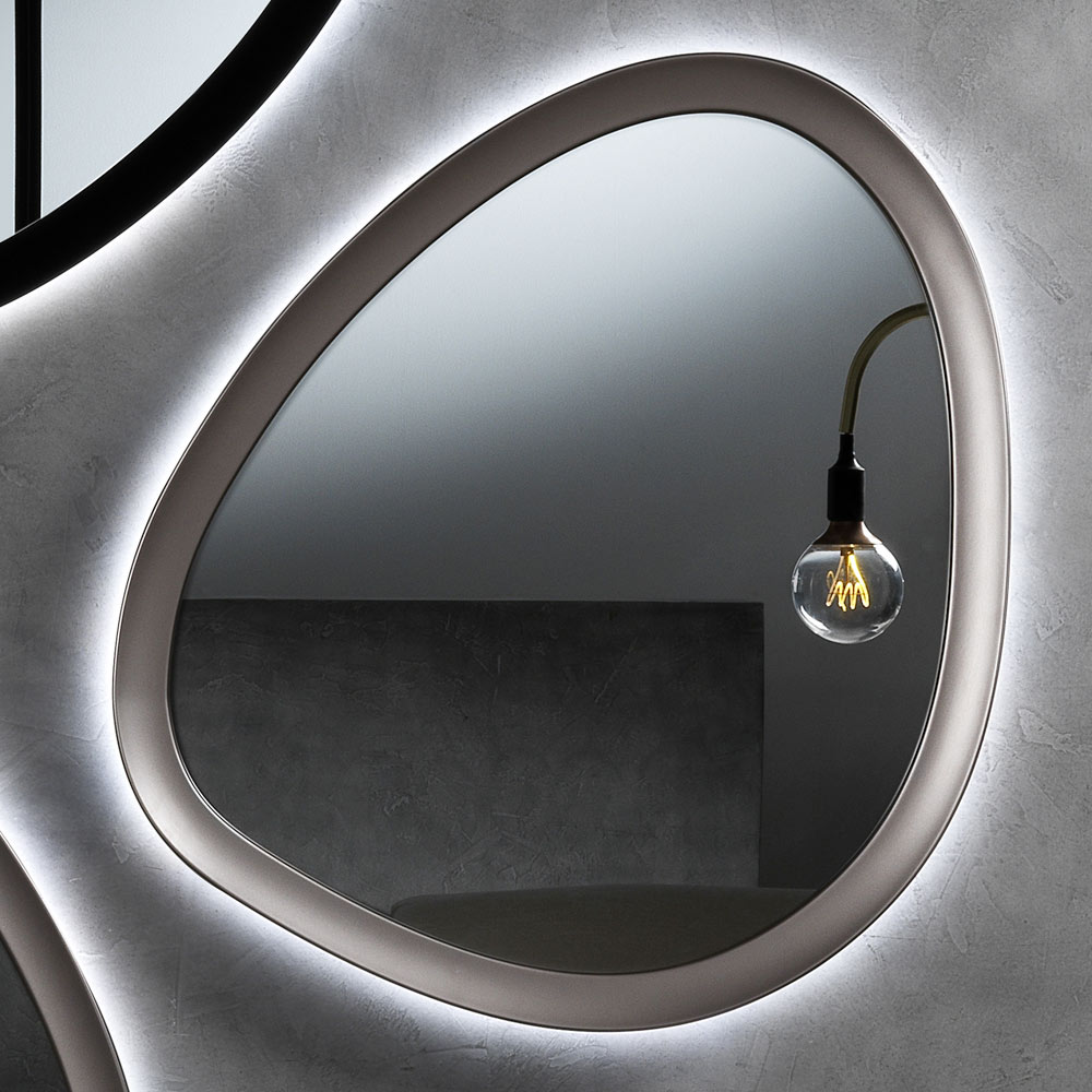 Fördjupa dig i charmen med denna bakgrundsbelysta spegel , ett riktigt inredningselement som förvandlar varje vägg till ett modernt konstgalleri. Med sin form tar den avstånd från konventionella och blir en samlingspunkt som fångar ögat och stimulerar fantasin.