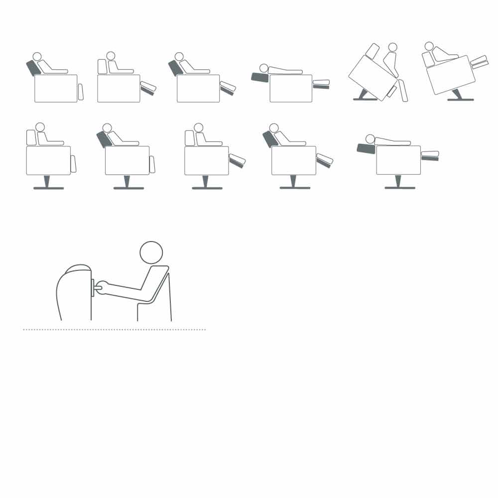 Mekanismer med en eller två motorer , fot- och ryggrörelser alternativt autonoma eller oberoende , lyftfunktion , lyftanordning som gör att du enkelt kan inta upprätt läge, vibromassage för en behaglig effekt fördelad på ryggstöd, sits och fotbräda, automatisk eller motoriserad rörelse, är dessa möjligheter och kombinationer utvecklade: en harmonisk uppsättning lösningar för att tillfredsställa alla behov.