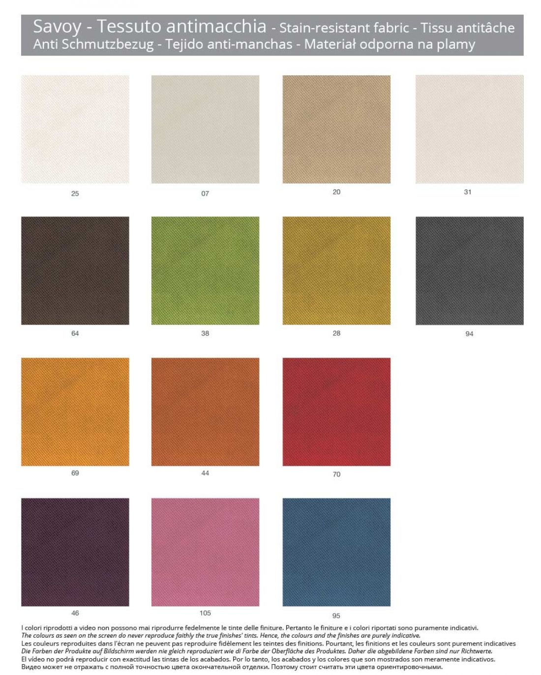 - Savoy fläckbeständigt tyg ; Savoy är ett modernt tyg, behagligt att ta på och mycket motståndskraftigt mot slitage och nötning. Den huvudsakliga egenskapen hos detta tyg är dess totala ogenomtränglighet för vatten: det är faktiskt märkt som "vattenavvisande". 89% polyester, 8% polyamid, 2% bomull, 1% viskos.