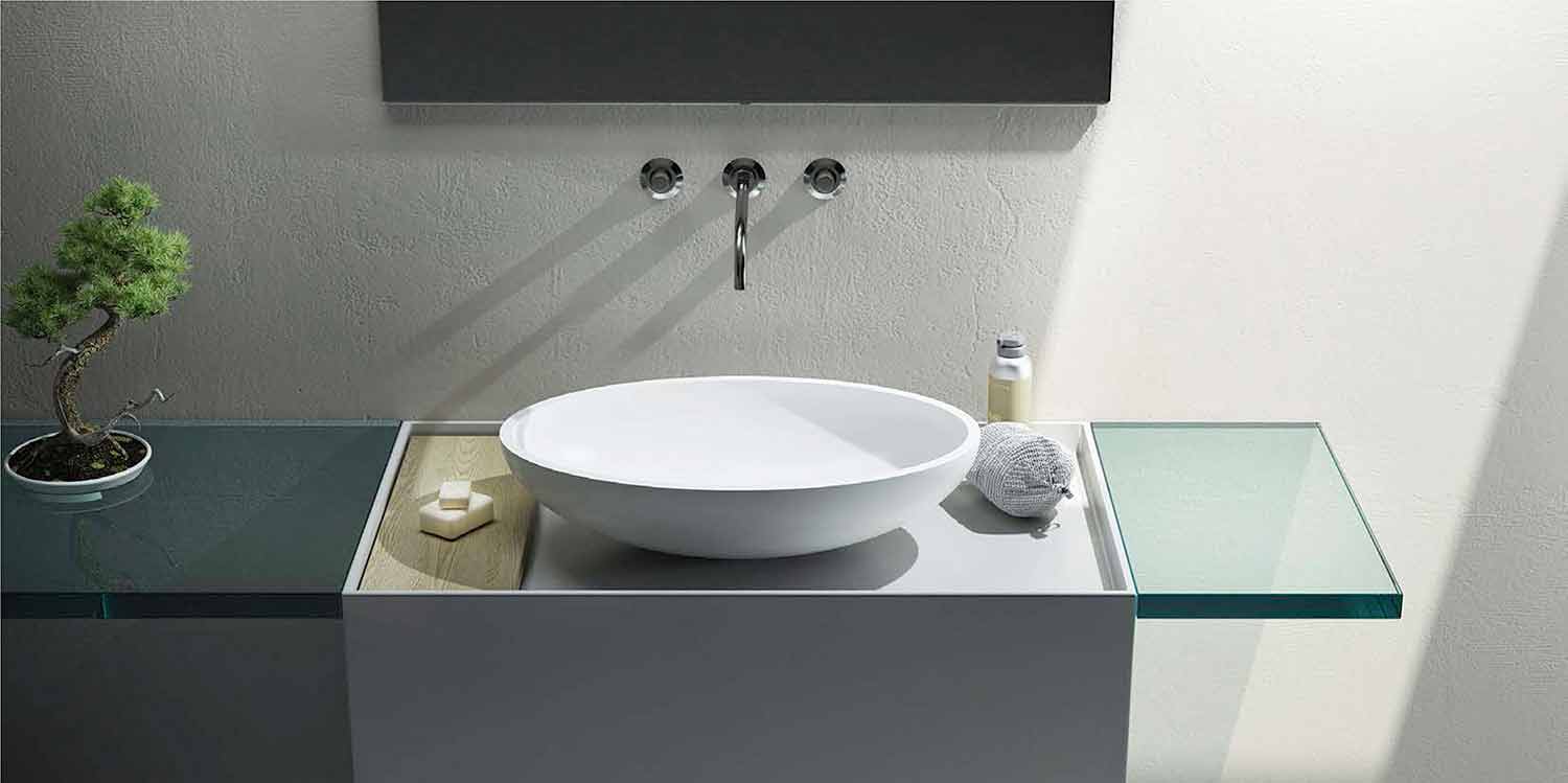 Frascati är en fristående fristående handfat gjord av solid yta med en oval växt.