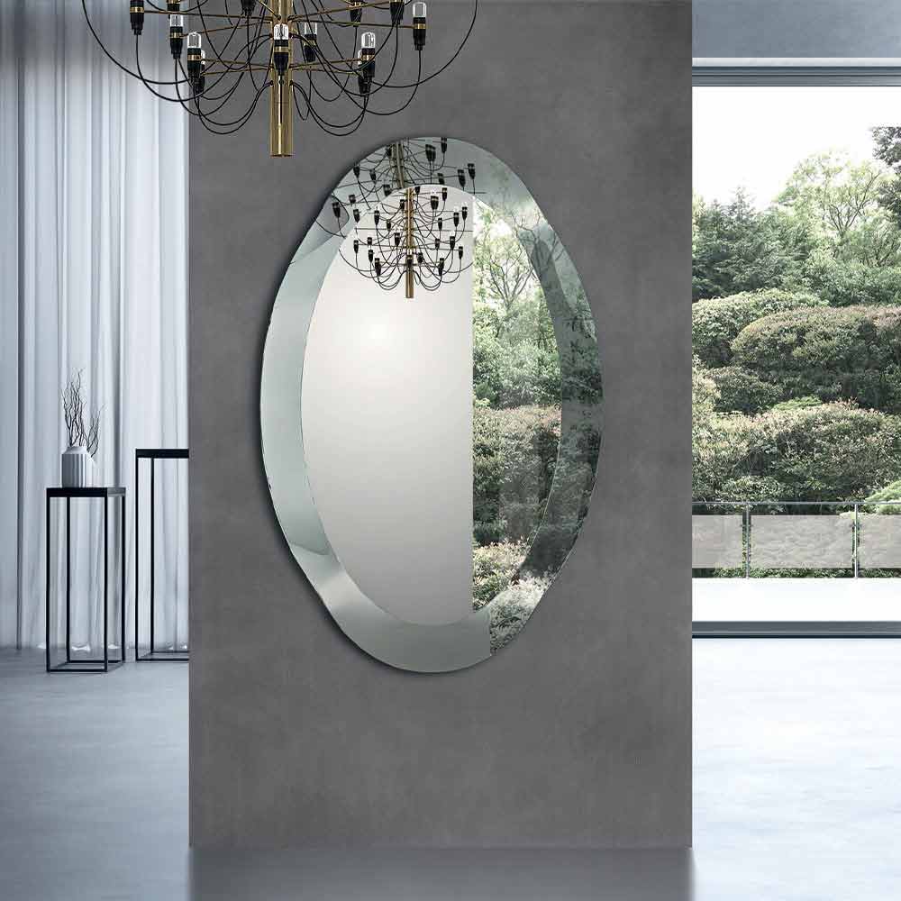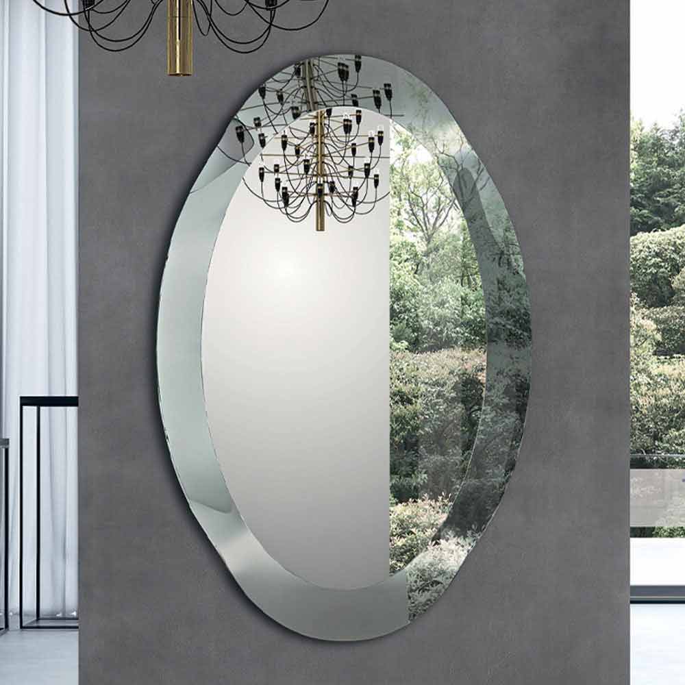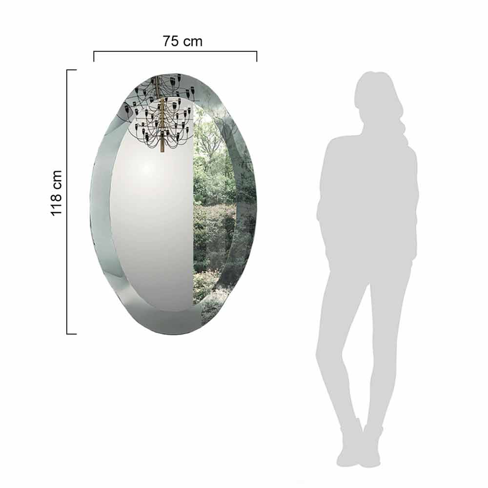 Oval väggspegel tillverkad i Italien med invändig spegel och 6 mm böjd glasram i spegelvänd kristallfinish .