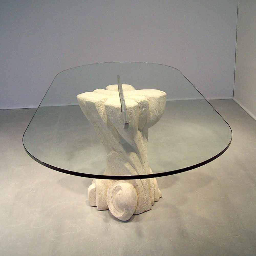 Modernt ovalt matbord Made in Italy med central bas i naturliga Vicenza sten , handskuren av det massiva kvarteret och med 15 mm tjockt floatglas topp som stöds av en borstad och lackerad råmetall bar.