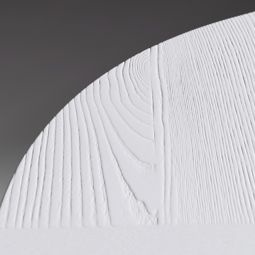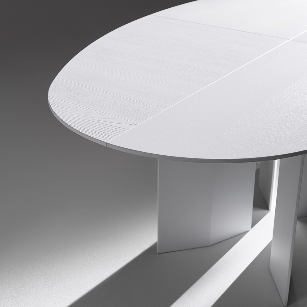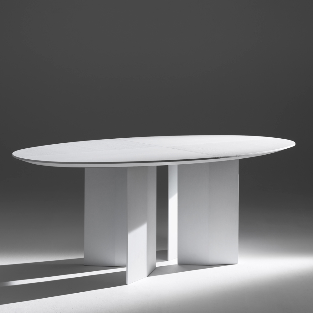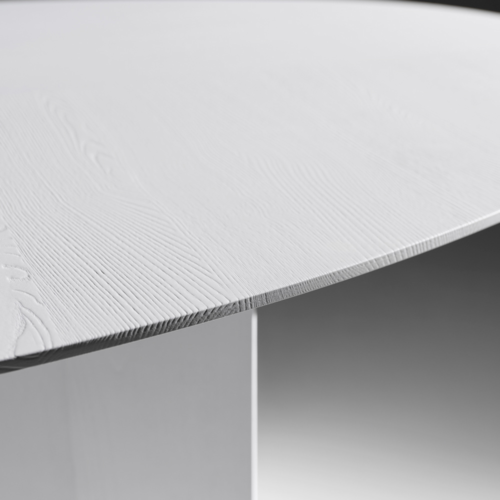 Bordet är tillverkat av värmebehandlad askfanérplywood och framhäver träets naturliga ådring, vilket förstärker dess texturerade karaktär och kromatiska djup. Det finns även i svart eller vit lack , vilket gör det mångsidigt nog att anpassa sig till en mängd olika stilar, från minimalistiska till djärva och grafiska.