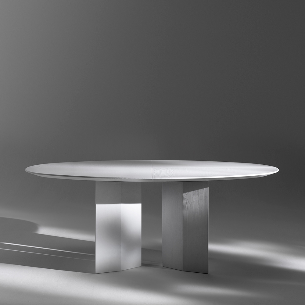 Detta ovala matbord utmärker sig med sin skulpturala och originella design, där full volym och balanserade proportioner skapar en visuellt slående möbel. Den ovala skivan samspelar med den centrala basen och skapar en solid och harmonisk komposition, designad för moderna och raffinerade utrymmen.