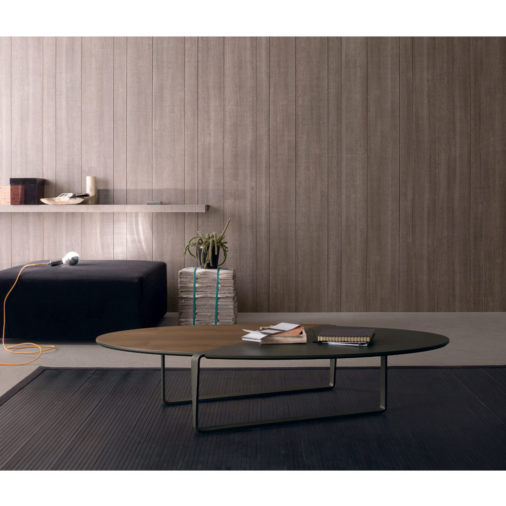 Det här ovala soffbordet har en präglad grafitpulverlackerad metallbas och en tvåfärgad träskiva i canaletto-valnötsfaner och metalliskt bronslackerat trä .