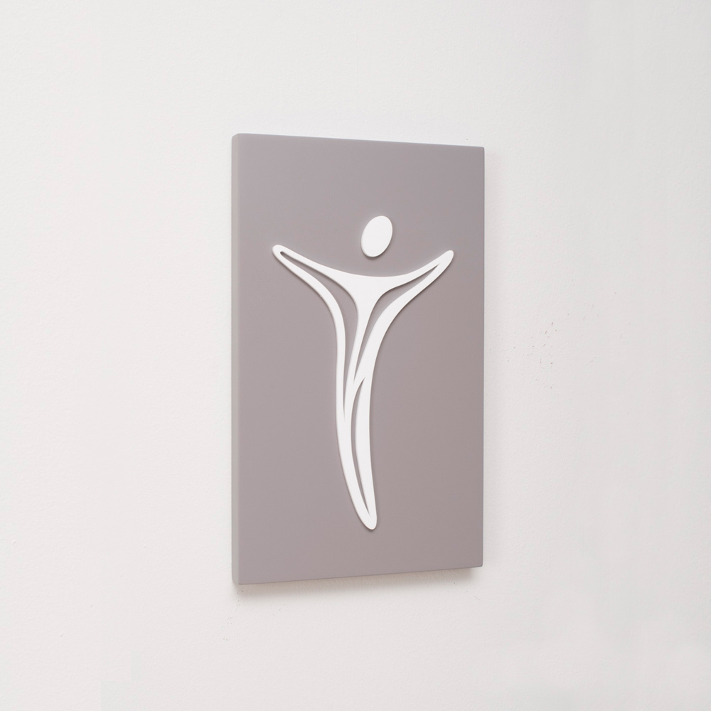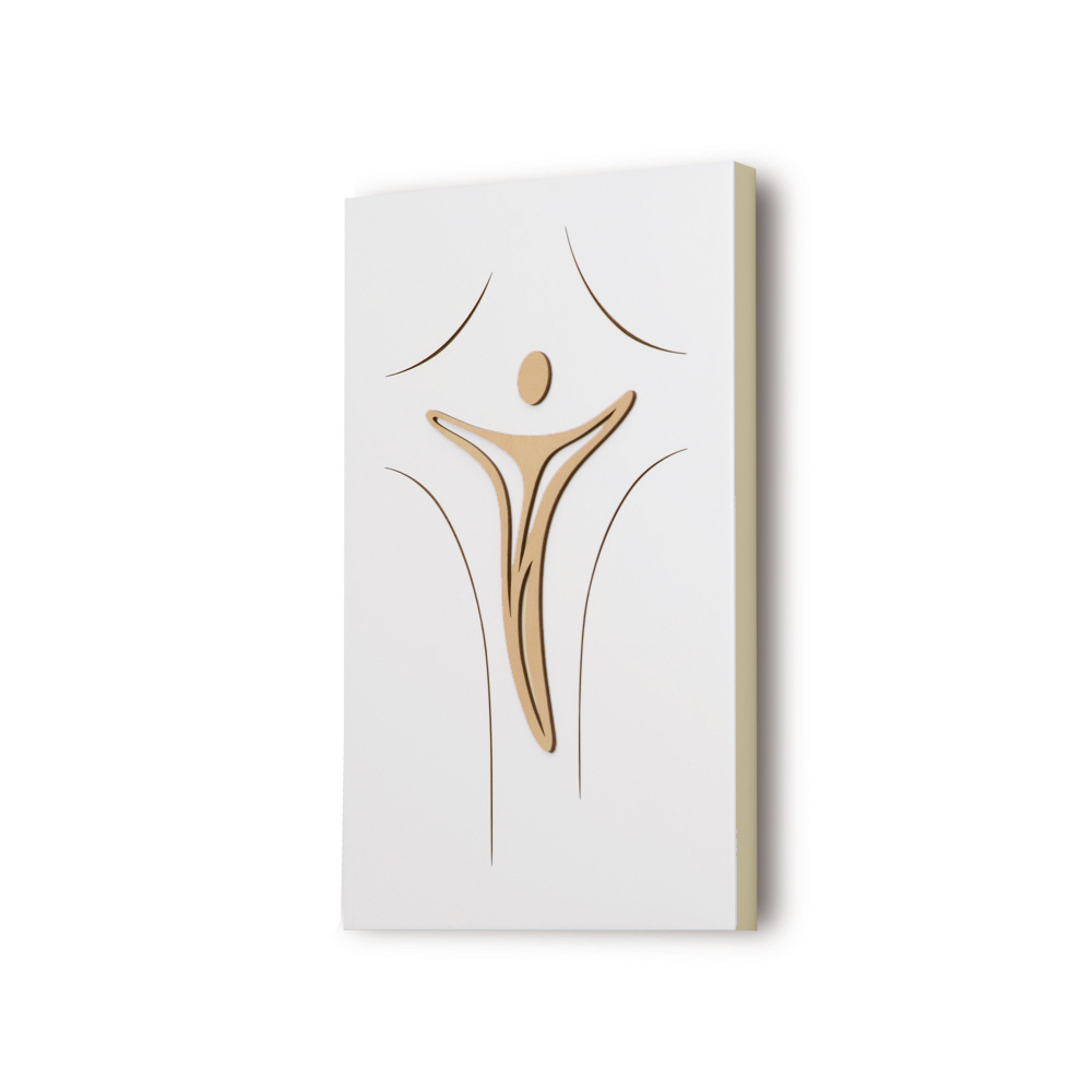 Bild/krucifix med lackerad träbotten och applikation . Lasergraverat "komma" . Hål för att hänga den på väggen.