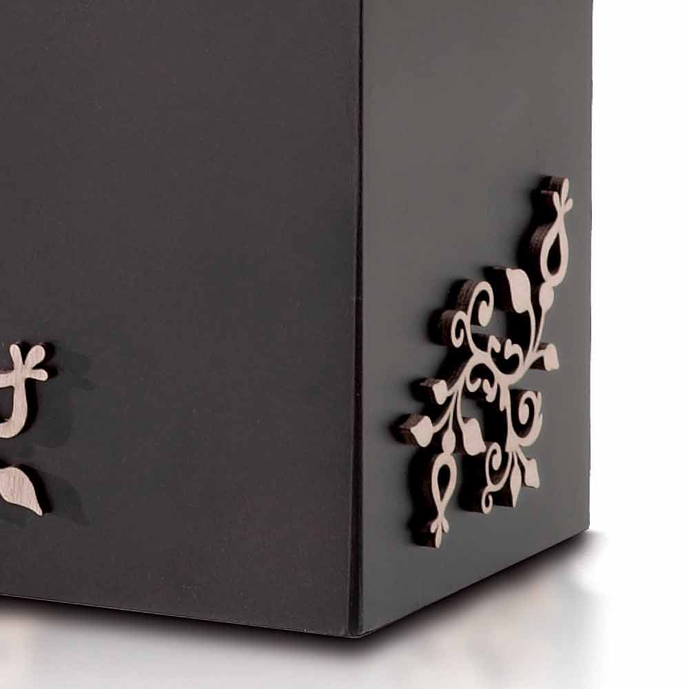 Paraplyställ i mörkt eller vitt trä med elegant laserskurna kontrastdekorationer, modern rektangulär design och tillverkad i Italien.