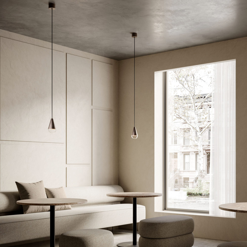 Made in Italy. De rena linjerna i samlingen av inomhuslampor framhäver renheten hos järnmaterialet. Det hängande elementet kan användas ensamt eller i kombination med andra, för att skapa linjära kompositioner eller grupperingar med en scenografisk effekt.