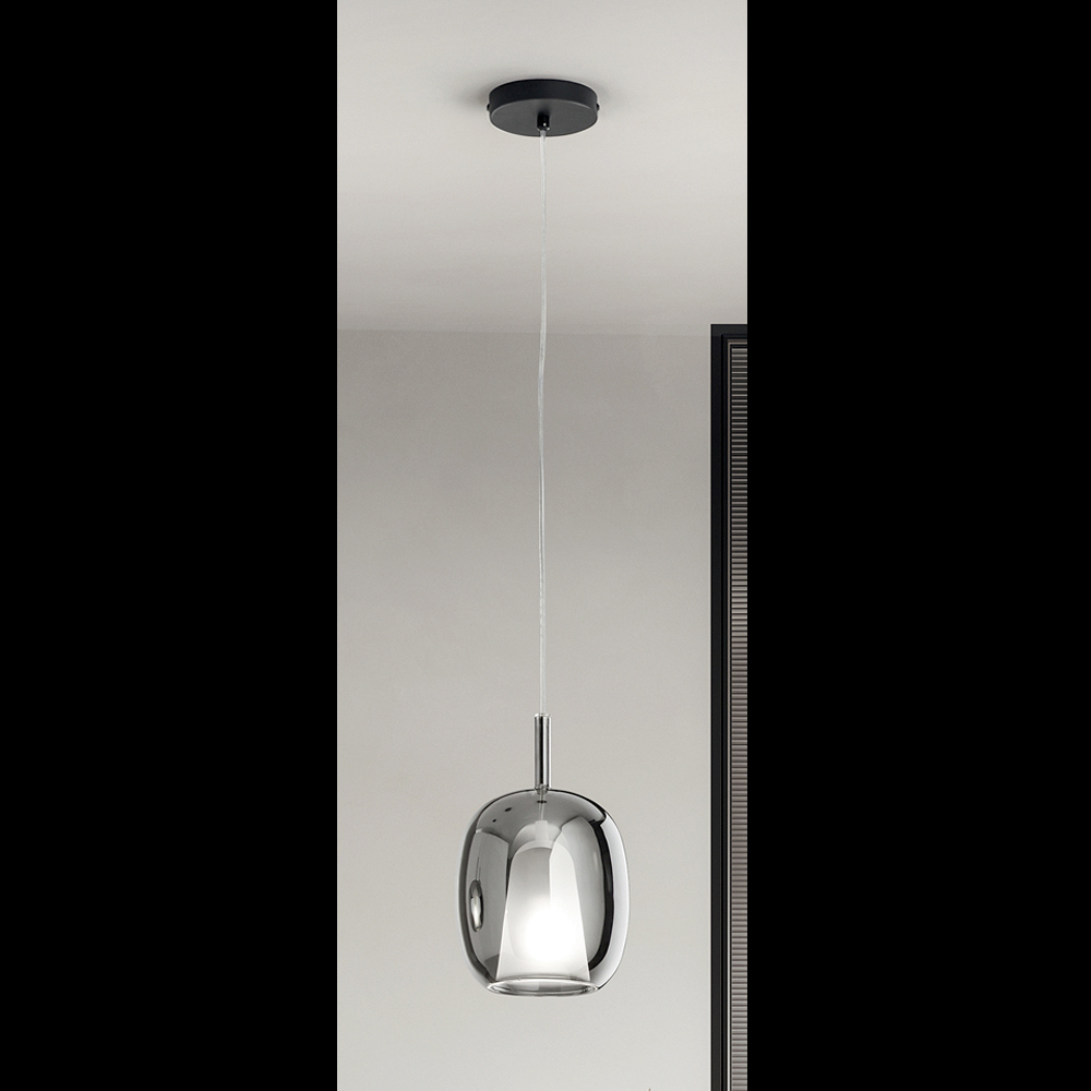 Lampa tillverkad med en takfot av metall och spridare av blåst glas , kännetecknad av ett dubbelt lager: invändigt i satinglas och utvändigt i färgat glas . Lock i polymermaterial för att stabilisera kabeln i ett centralt läge. Justerbar kabel.