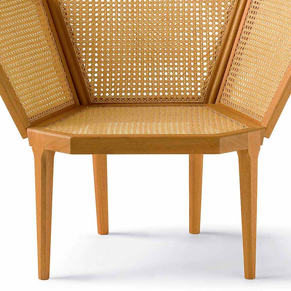 Fåtölj Cannata bestående av femhörningar. En klassisk inredning, trä stol med säte i Wien halm typisk för det tidiga nittonhundratalet, är revisited i en futuristisk look där de traditionella bearbetningsmetoder skjuter med trohet och behärskning, men kurvorna och mjuka former den ursprungliga modellen ledighet rymd förenklade linjer och kristalliserade former som förökar i rymden.