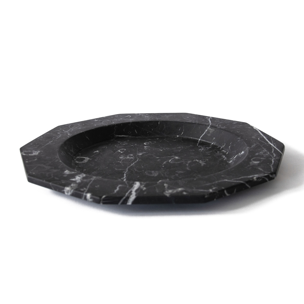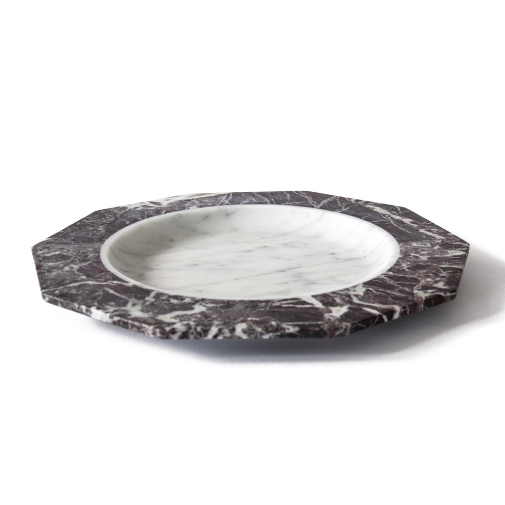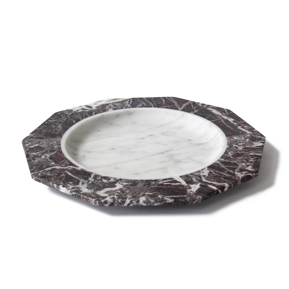 Satängtallrik i vit, svart eller vit och röd Levanto-marmor tillverkad i Italien.