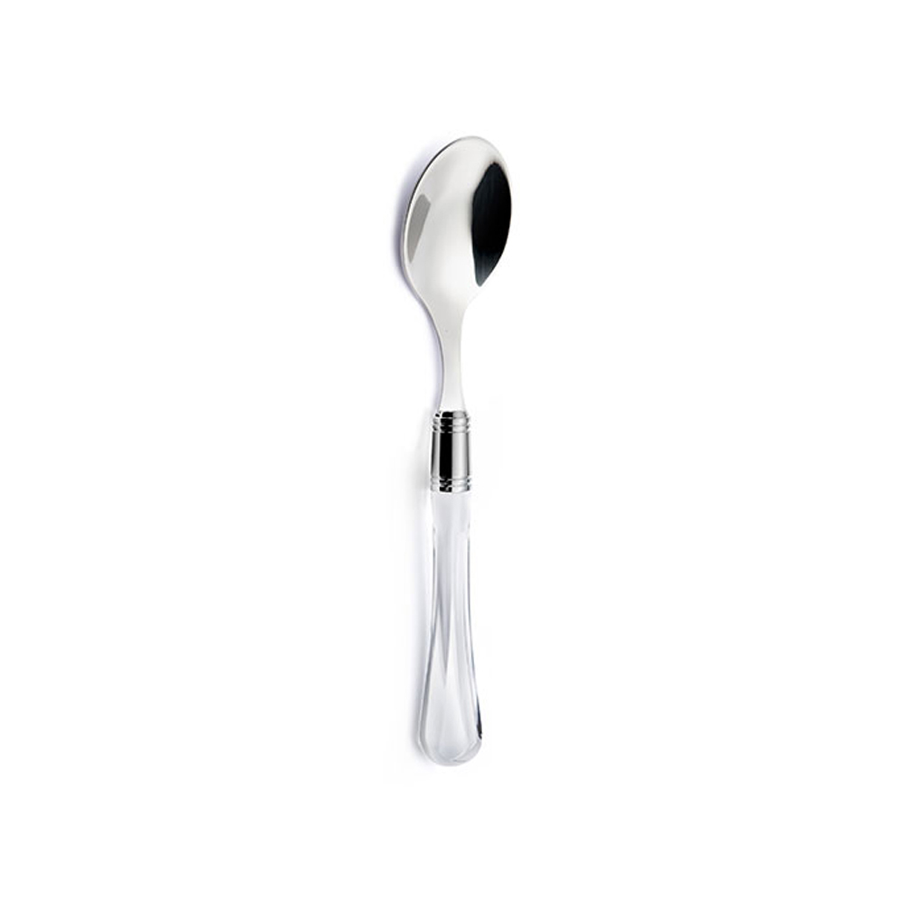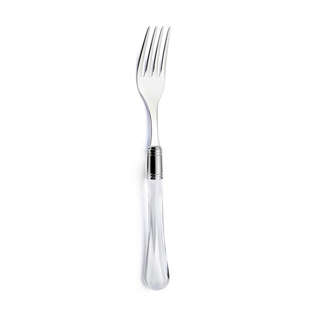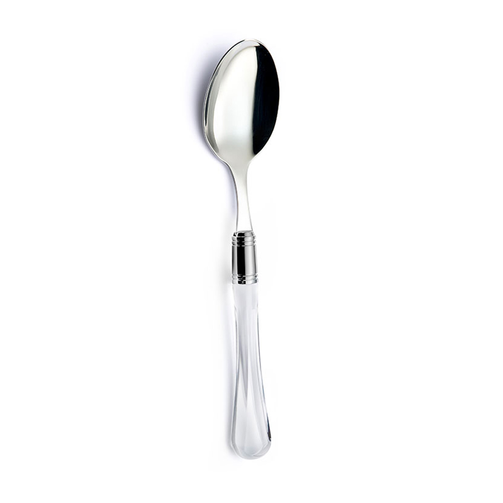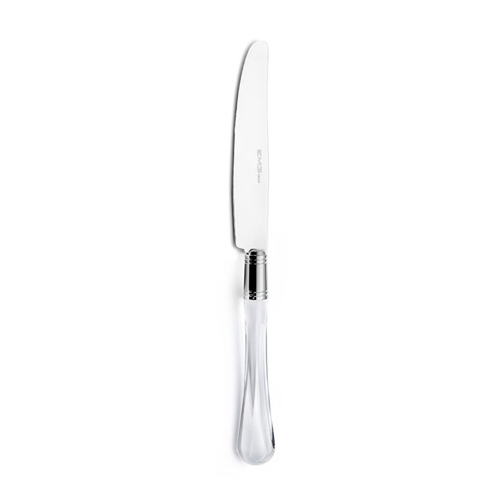 kromade ringen spelar en dubbel roll: den döljer inte bara ståltransplantatet i det genomskinliga handtaget, utan gör också besticken lika viktiga som en riktig juvel.