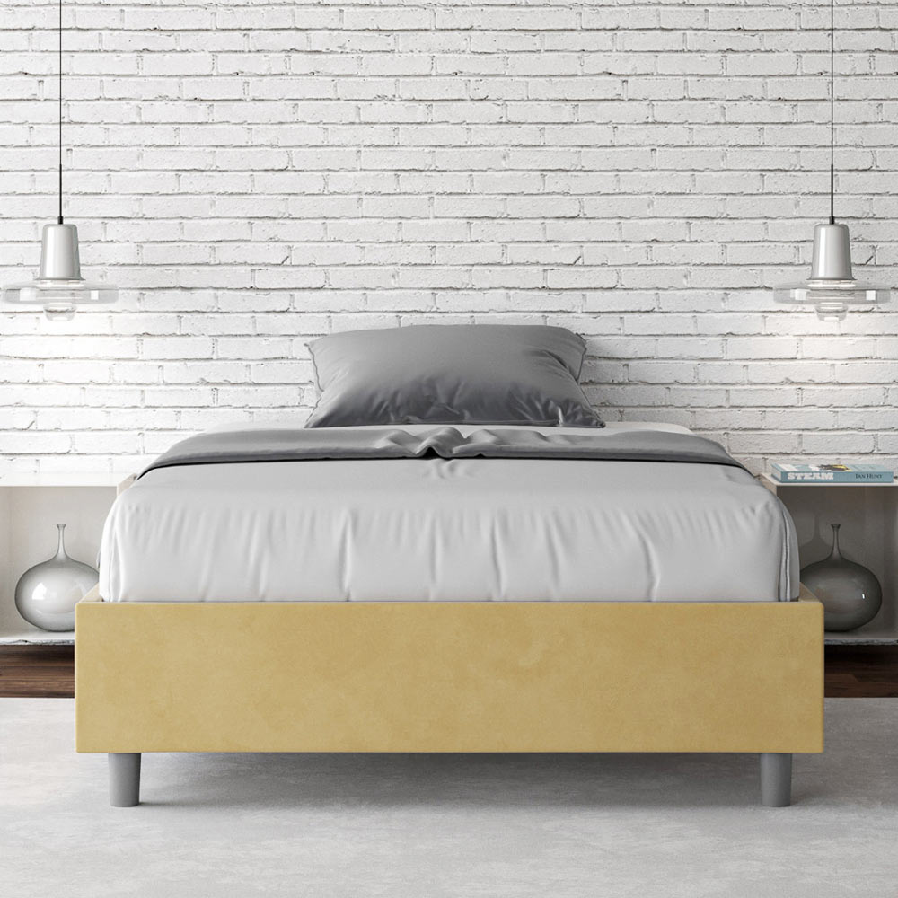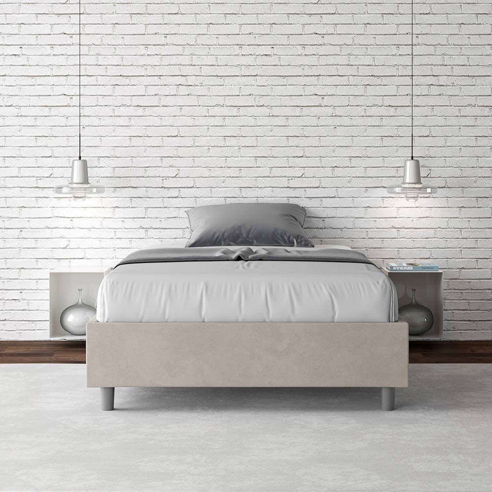 Fransk säng 140x200 cm stoppad i melaminpaneler och klädd i mikrofiber , helt tillverkad i Italien. Denna franska säng utmärker sig med sin rena, minimalistiska design . Dess diskreta estetik och mångsidighet gör den enkel att integrera i alla miljöer. En av dess utmärkande egenskaper är avsaknaden av en traditionell huvudgavel , vilket gör den idealisk för placering i unika utrymmen, till exempel under ett fönster, på vinden eller nära en dekorativ vägg, utan att skymma utsikten eller uppnå önskad effekt.