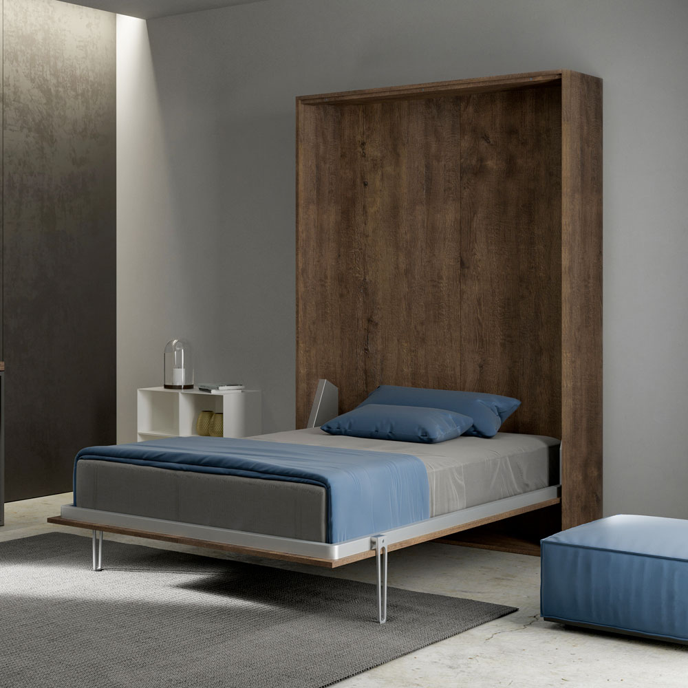 Sängramen är tillverkad av 18 mm tjock melaminspånskiva , vilket garanterar motståndskraft och hållbarhet över tid. Öppningsmekanismen är smidig och säker och förvandlar väggen till en bekväm säng med en enkel gest.