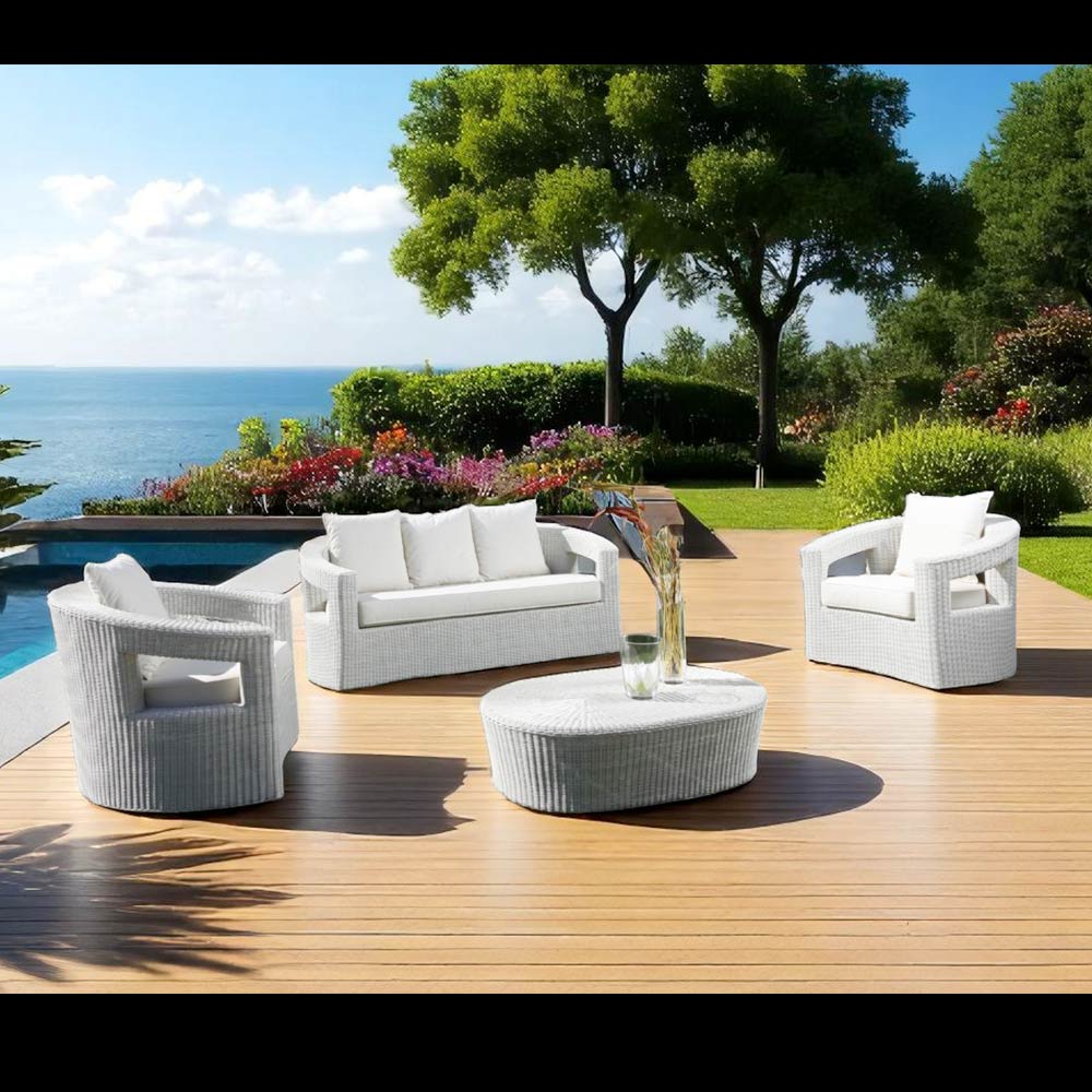 Polyrottingstommen ger en touch av motståndskraft och hållbarhet mot elementen, och bevarar sin skönhet över tid. Det matchande soffbordet är det perfekta komplementet för att servera drycker och snacks, vilket gör det till den perfekta uppsättningen för dina gäster och för dina utomhuskvällar.