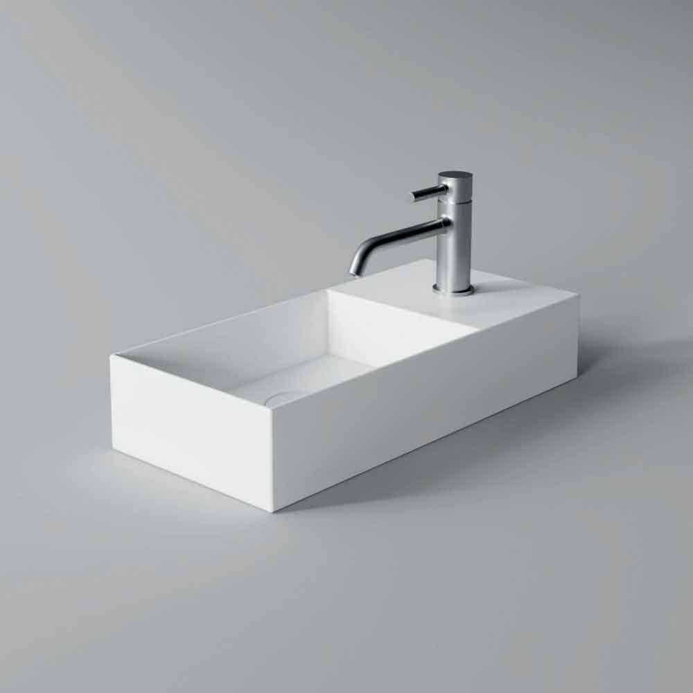 tvättställ , designade för små badrum, som dock inte vill ge upp kvalitetsinredning.