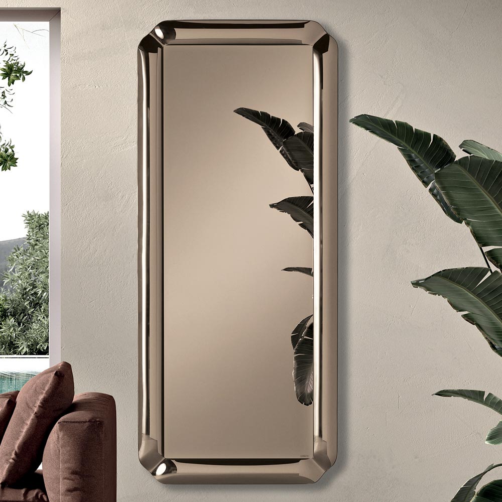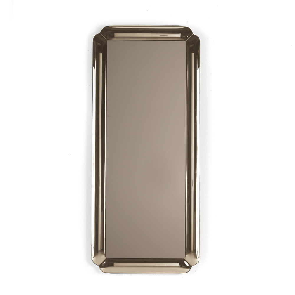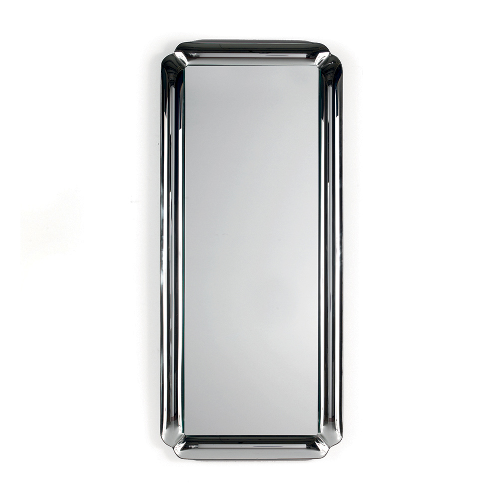 Spegeln har en rektangulär form utsmyckad med en ton-i-ton gjuten kristallram med fint formade hörn . Den reflekterande plattan vilar på ramen och skapar ett raffinerat djupspel som framhäver ytan och ger kompositionen en lätthet.