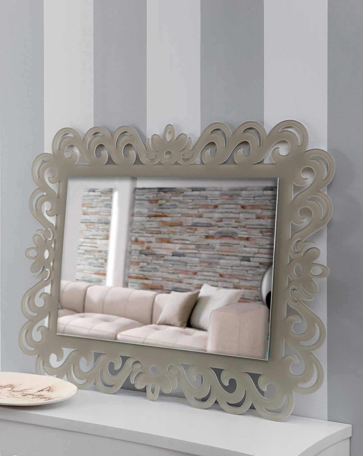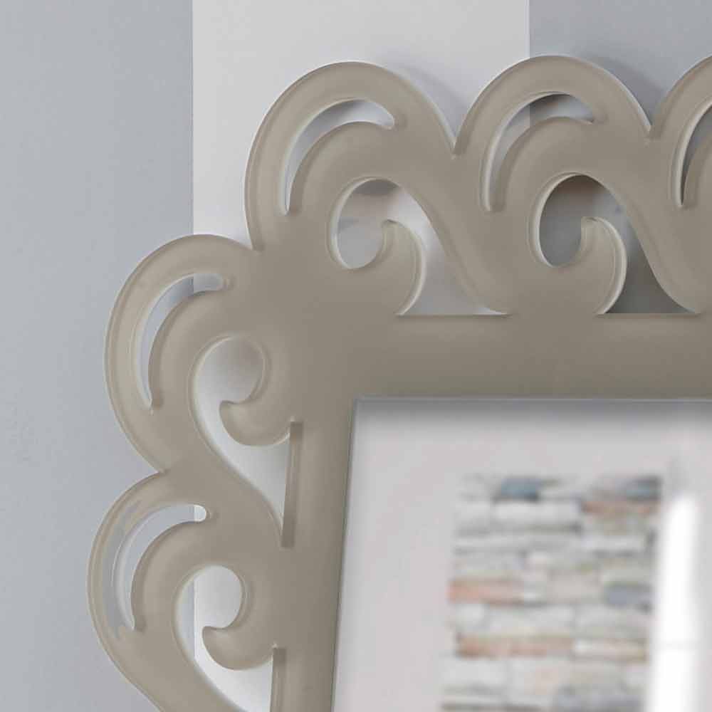 Rektangulär väggspegel med blommig ram, i duvegrå plexiglas av modern design tillverkad i Italien.