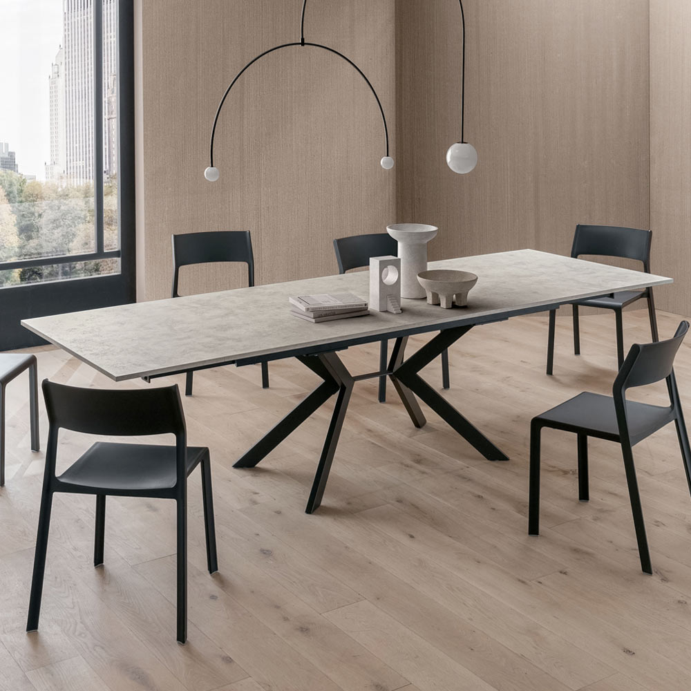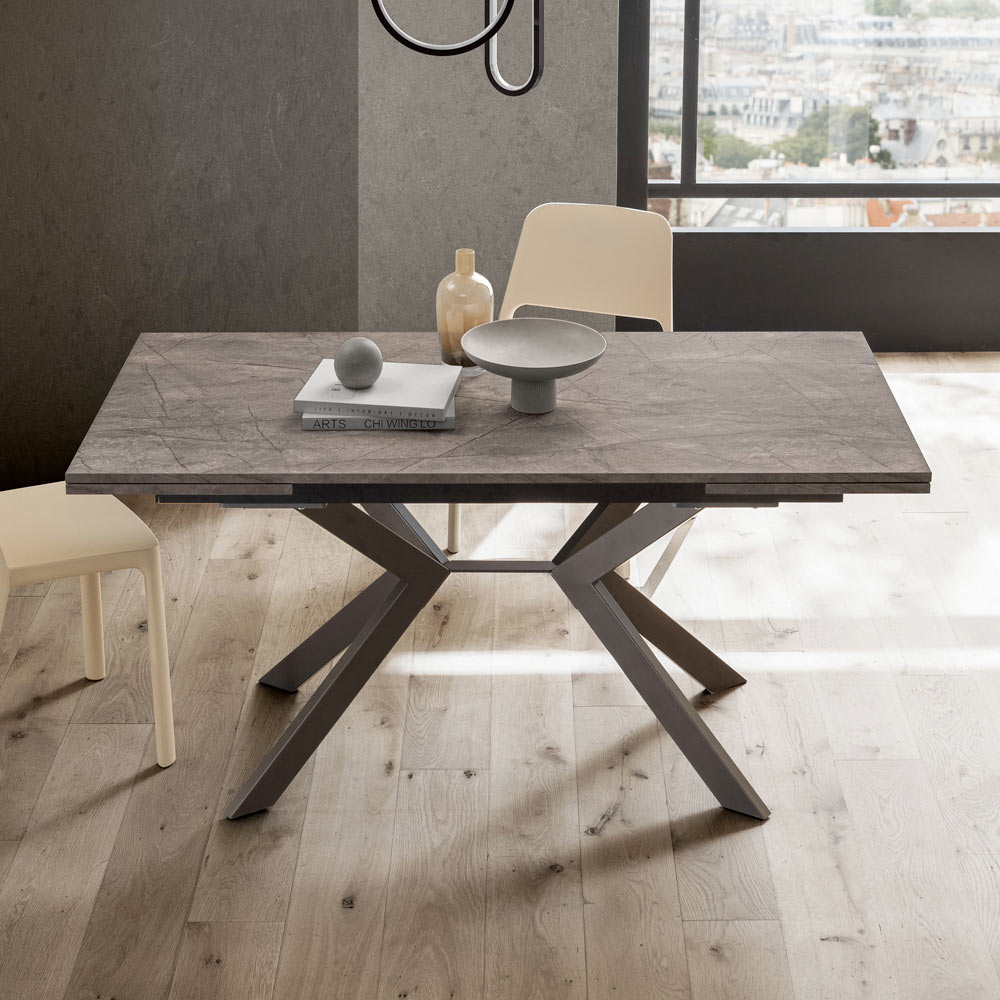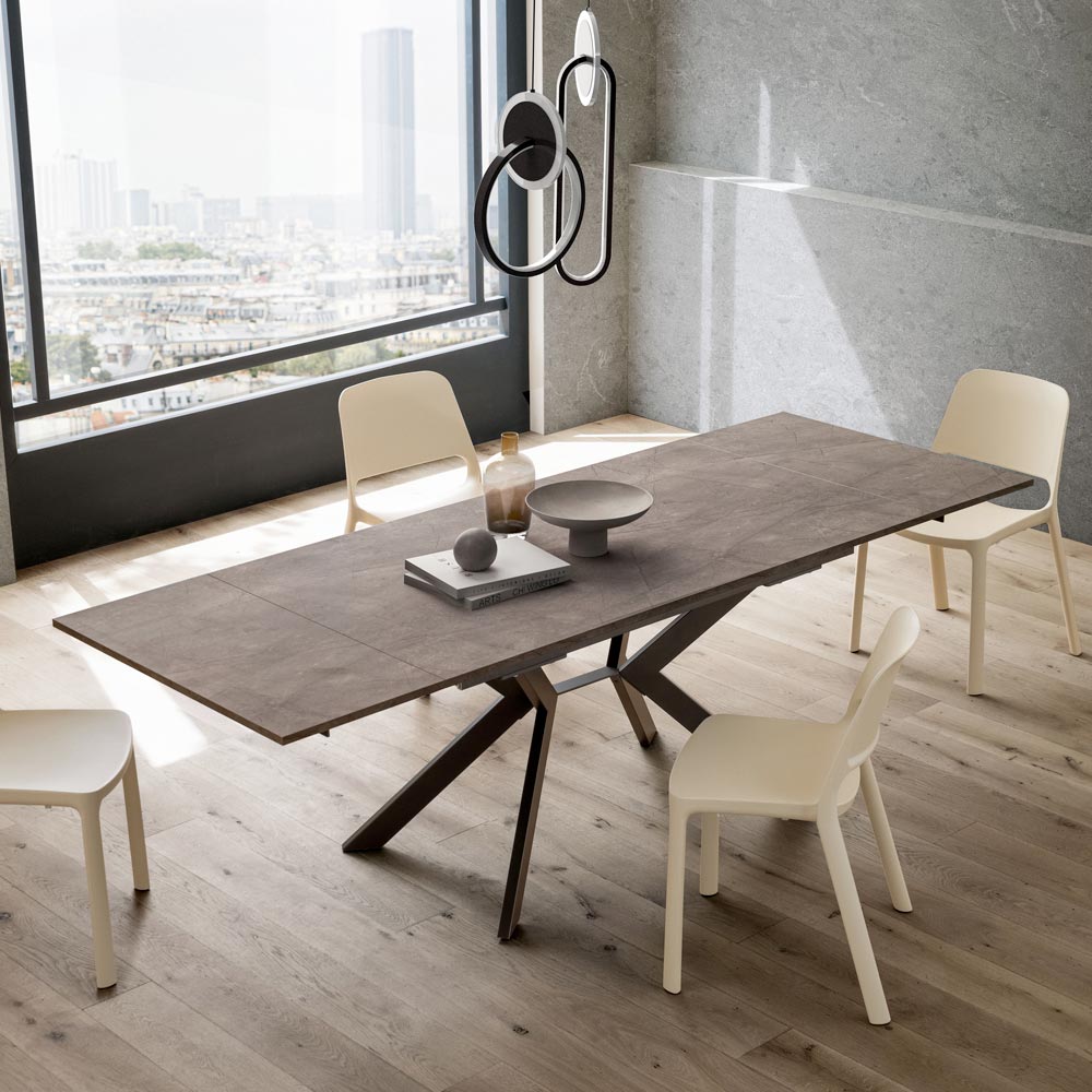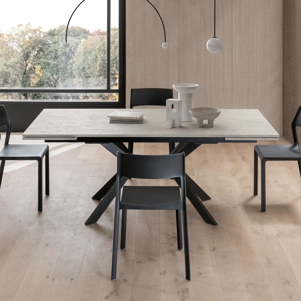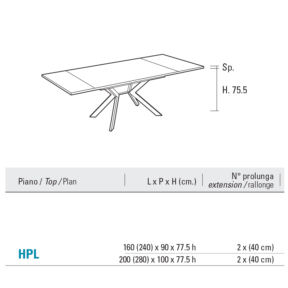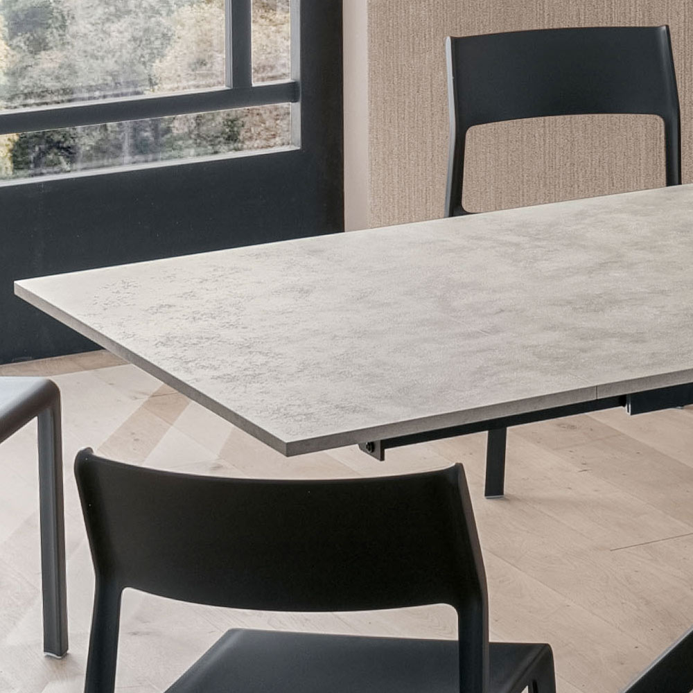 Elegans och praktiska egenskaper möts i detta utdragbara bord i HPL och metall , designat för dig som vill ha en möbel med en stark visuell effekt, men extremt funktionell.