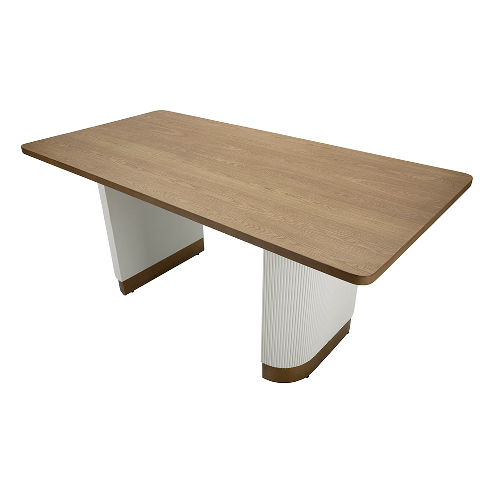 Detta matbord är en oklanderlig syntes av stil och funktionalitet , en möbel designad för att berika alla miljöer med sin diskreta men ändå distinkta närvaro. MDF-ytan, med varma naturliga toner, kontrasterar harmoniskt med den vita basen med vertikala spår, och erbjuder en raffinerad visuell struktur och en design inspirerad av elementen i klassisk arkitektur.