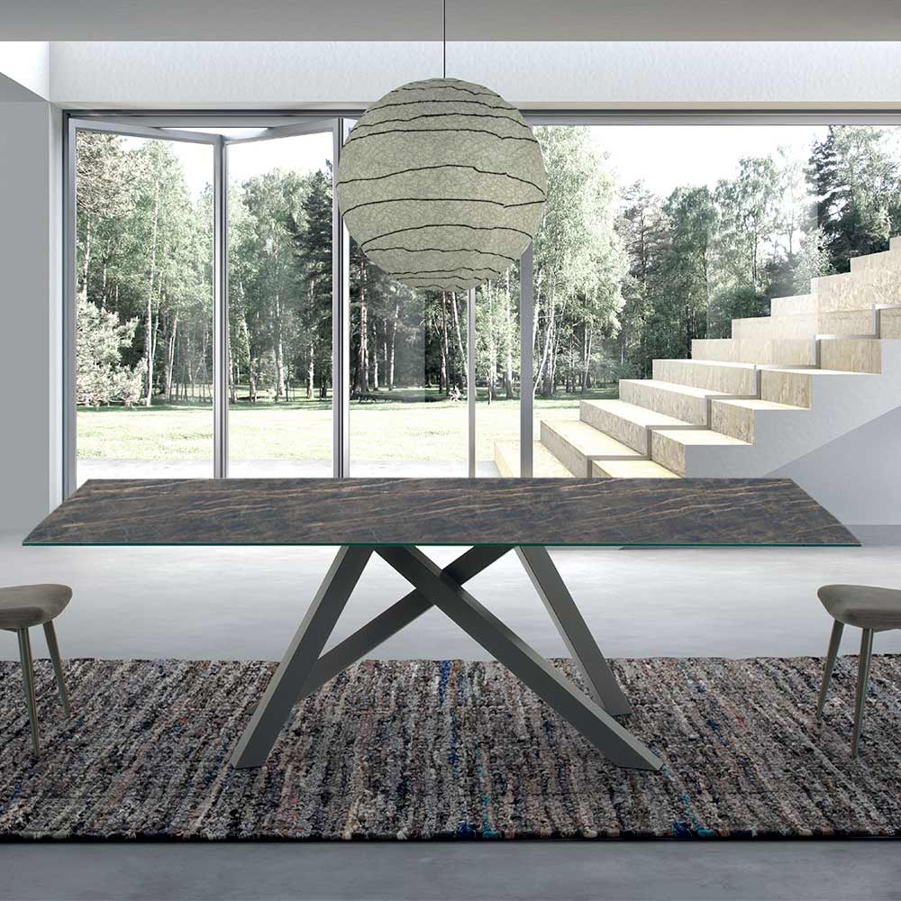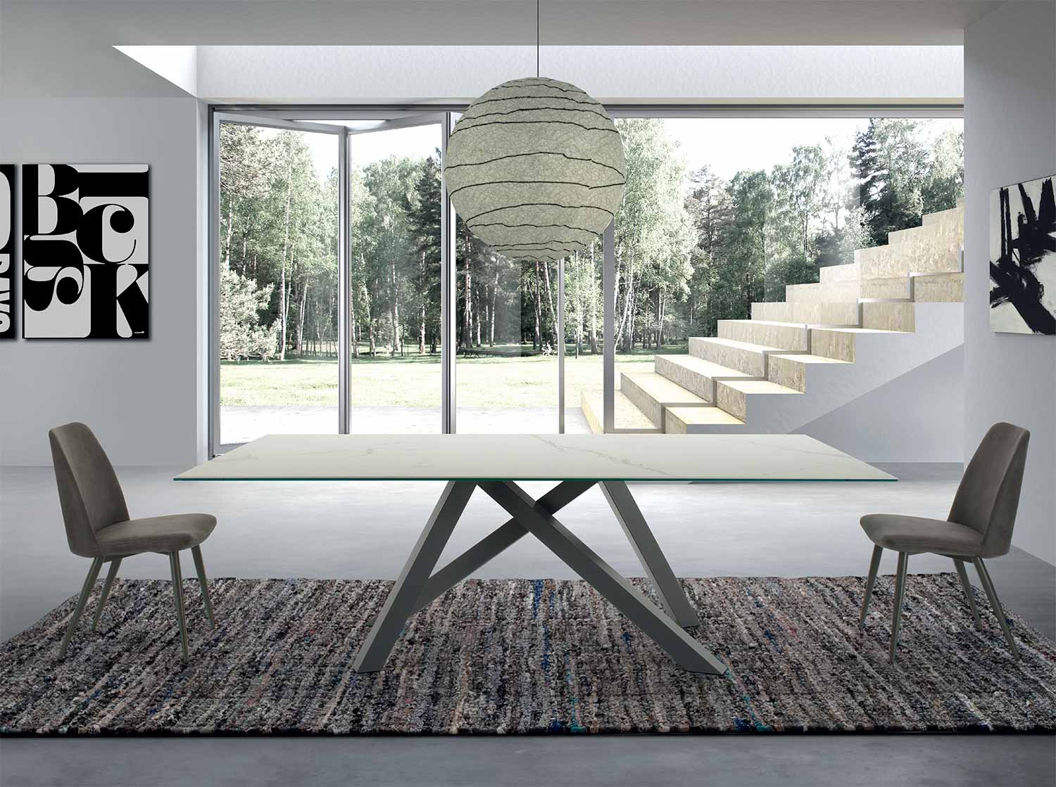 Bord med keramisk skiva och duvgrå stålfot av modern design tillverkat i Italien.