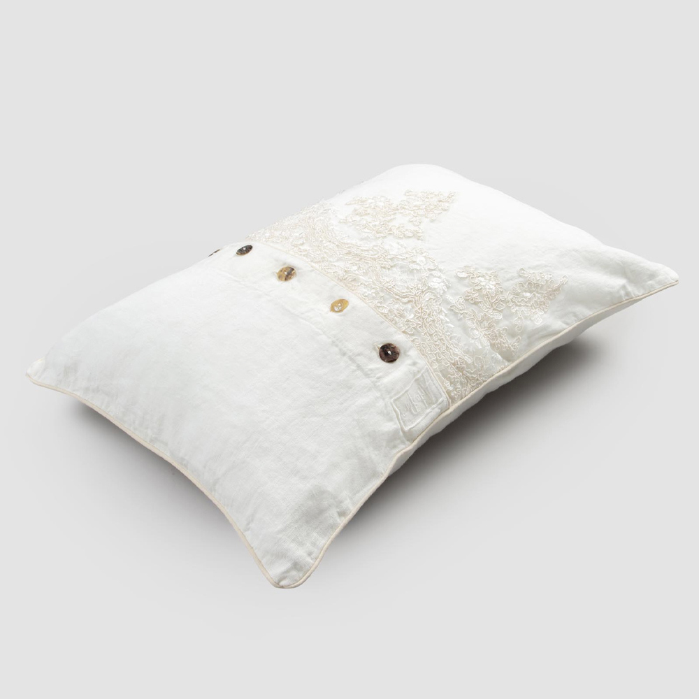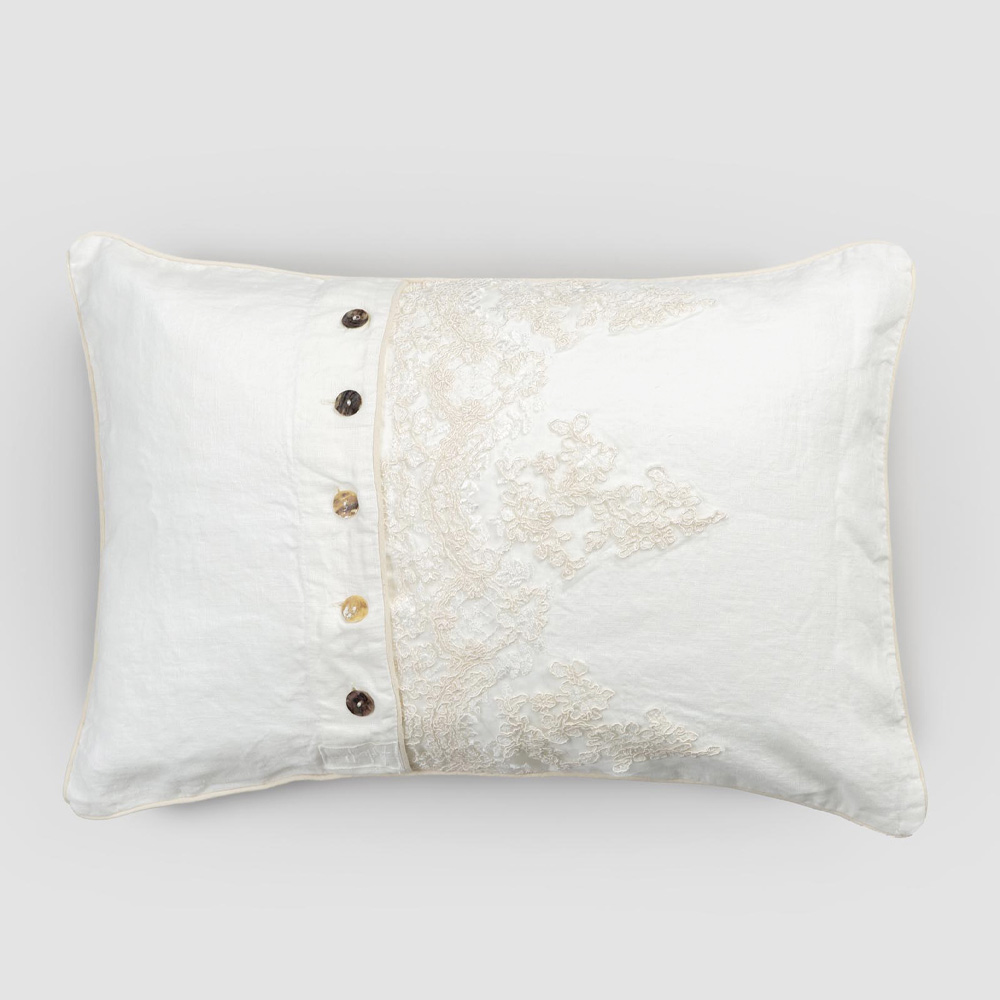 Traditionens värde ansluter sig till den moderna livsstilen med denna naturliga vita linned örngott dekorerad med en central rad Agoya-knappar i pärlemor och elegant spets , rörprofil .