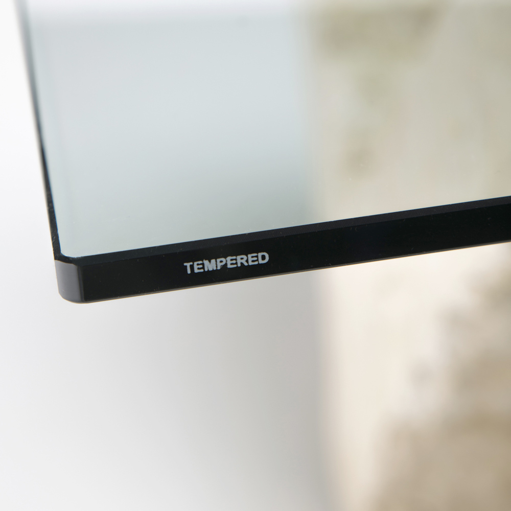 Soffbord med vit fossil stenstruktur och 10 mm polerad glasskiva.