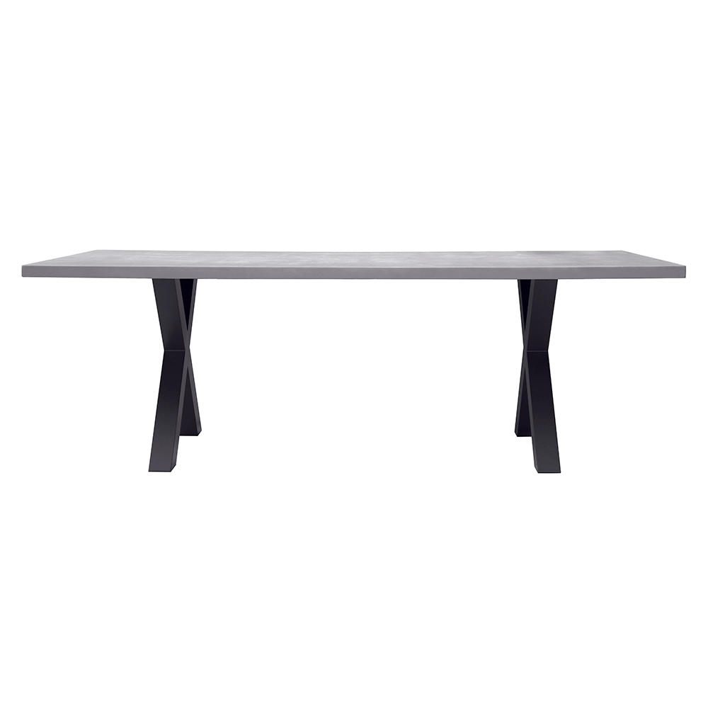 Den grå hartsskivan kombinerar elegans och praktiskhet, vilket garanterar en hållbar och lättstädad yta som är lämplig för alla väderförhållanden. De korslagda aluminiumbenen ger strukturen ett dynamiskt och modernt utseende samtidigt som de säkerställer stabilitet och robusthet.