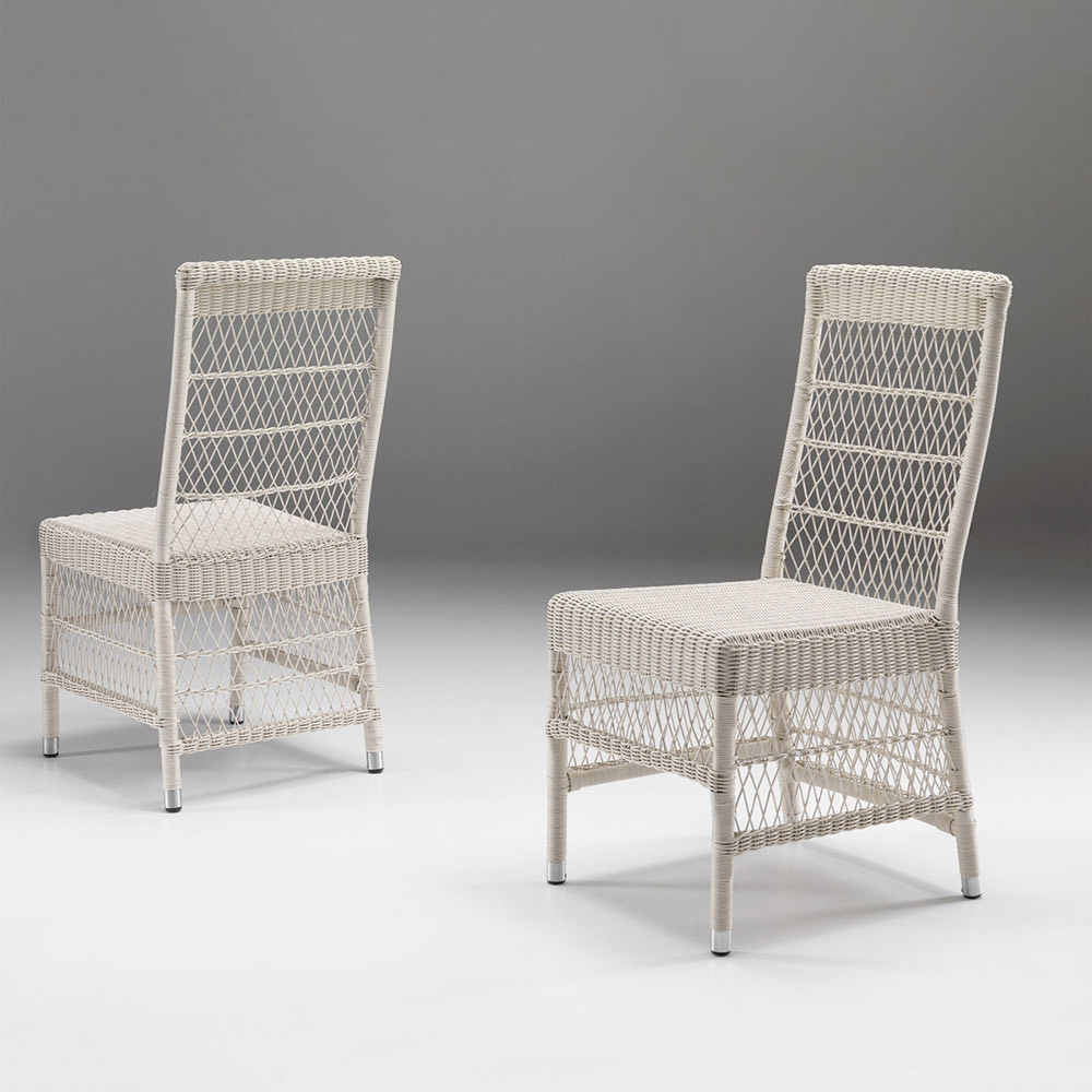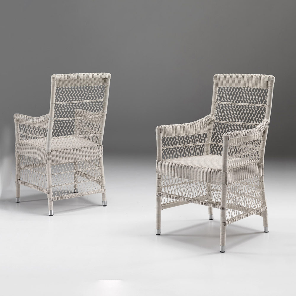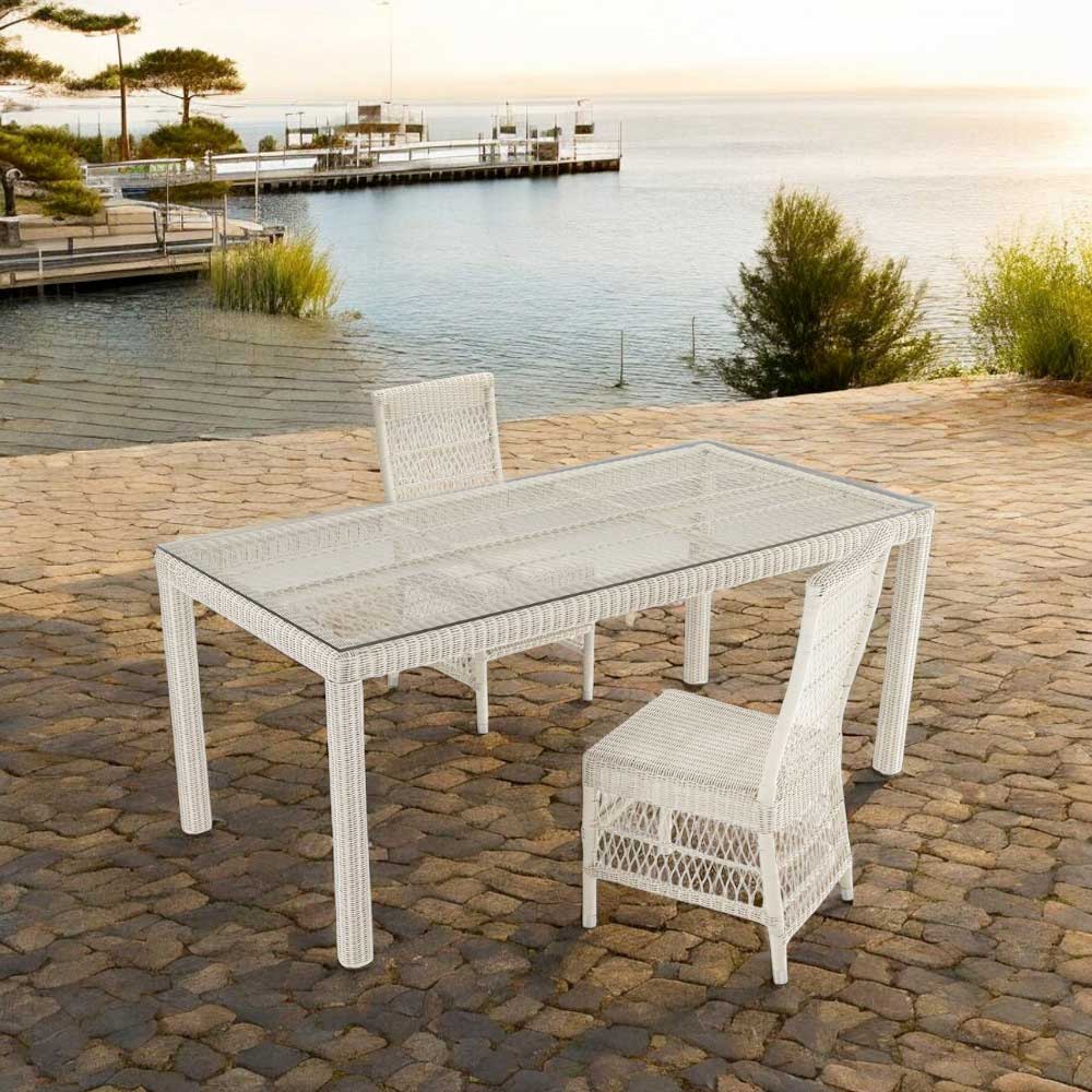 skiva i glas, 4 stolar och 2 fåtöljer med armstöd med aluminiumram och polyrattanväv av märket REHAU. Denna komposition kännetecknas av sin starka