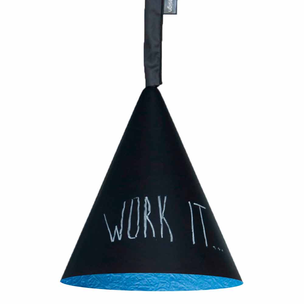 En märklig egenskap hos Jazz Lavagna lampan är dess yta, utformad för att skrivas och raderas, precis som en riktig svart tavla.