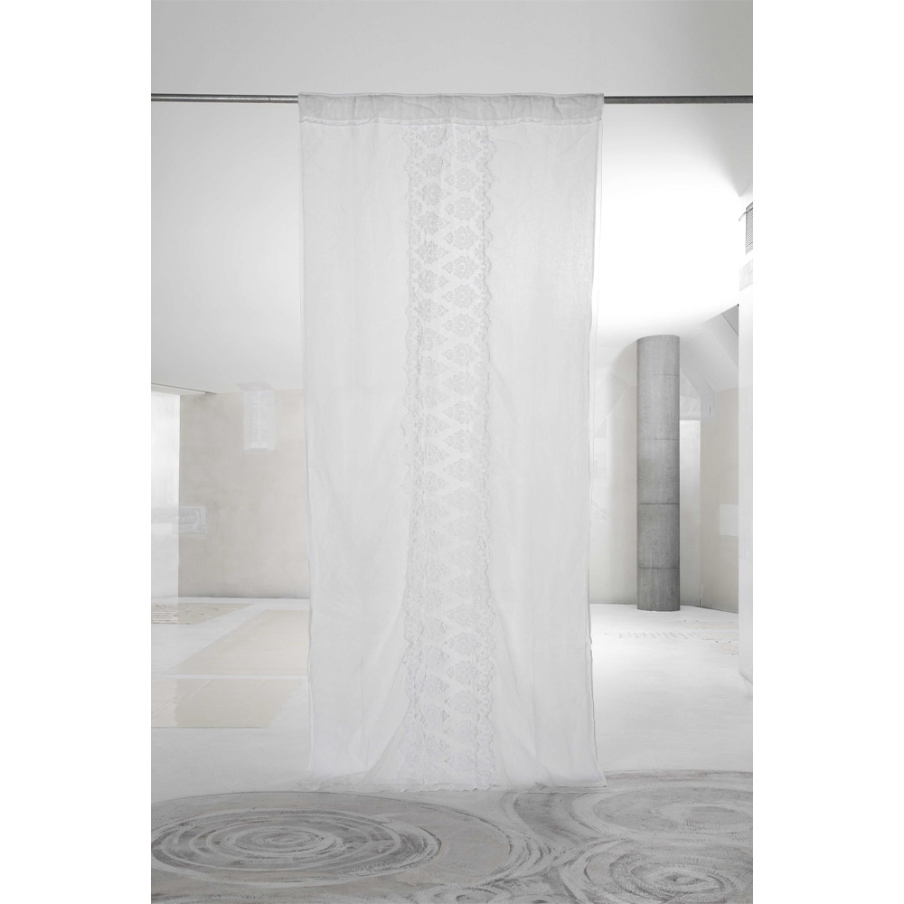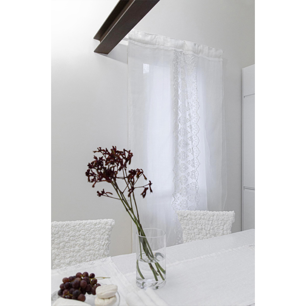 Naturligt linne- och organzagardin med central vertikal broderi och anlag för stav, tillverkad i Italien.