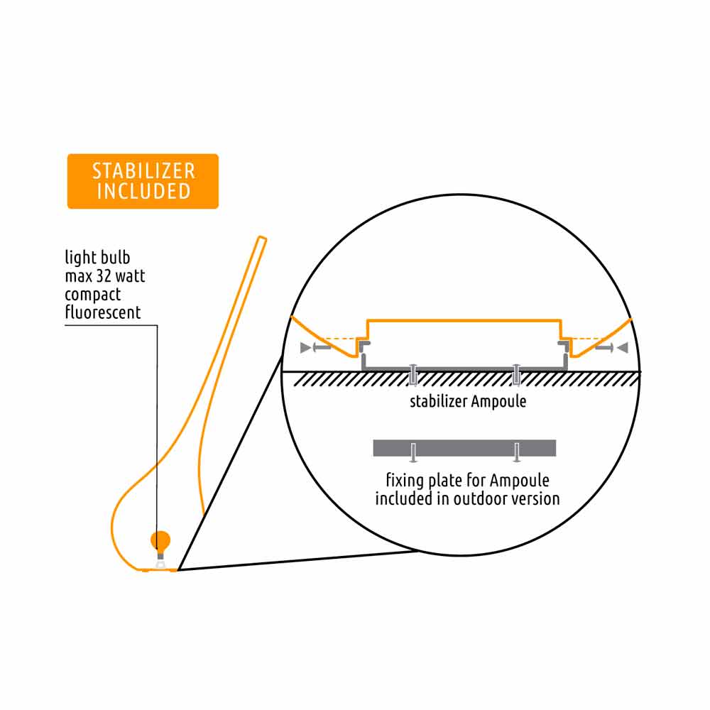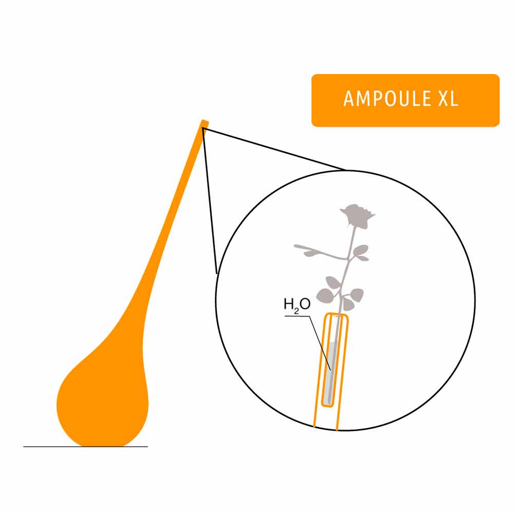 En droppe ljus med en arketypisk och ren form som i sin dynamiska fart berättar den ojämförliga poesin om en blommas gåva. Detta är den inspirerande tanken på en jättevas för en enda blomma, ett verk som kännetecknar varje utrymme med sin enkelhet och berättar magiens historia. Ampullen XL sträcker sig till 205 cm i höjd från marken, lämplig för både inomhus och utomhus.