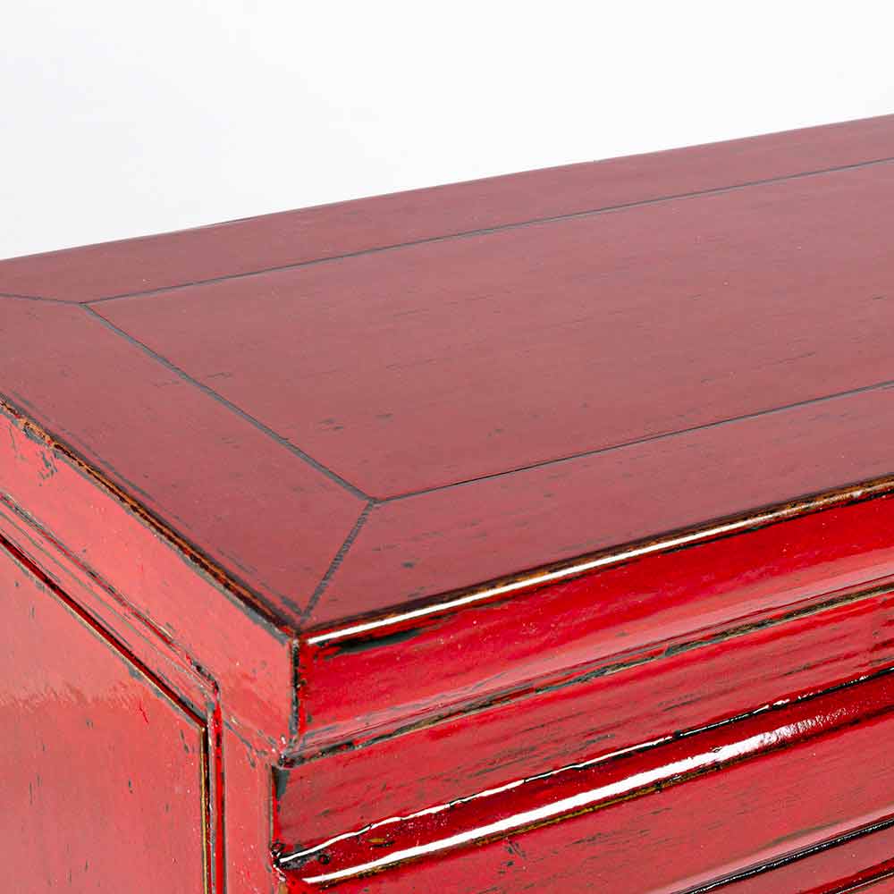 Rött konsolbord i almträ med 3 lådor i vintagedesign.