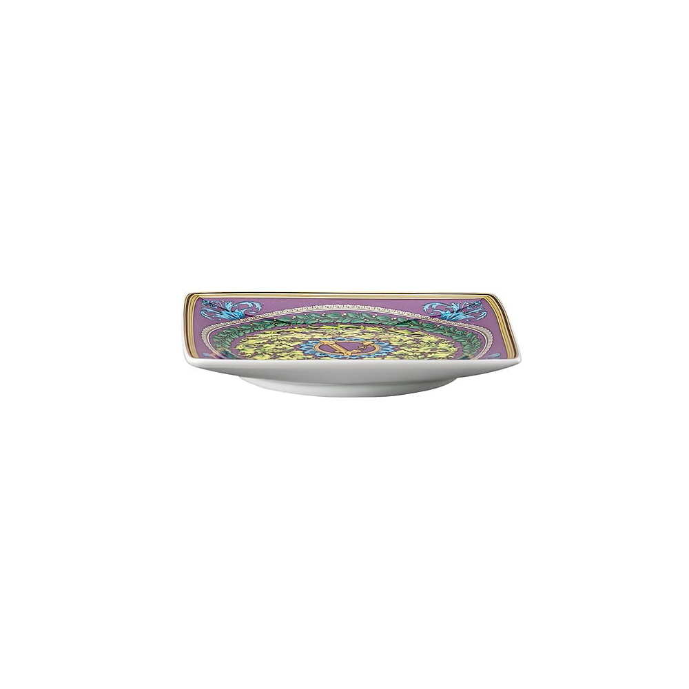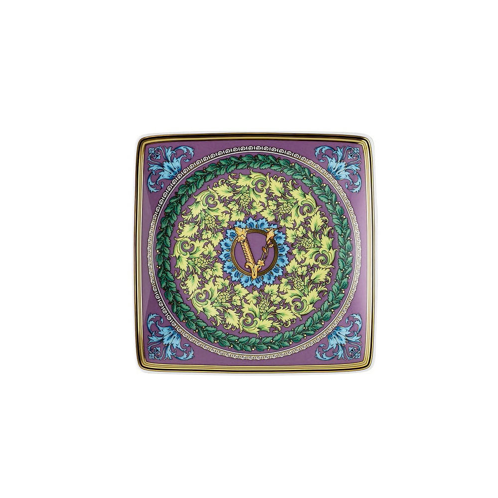 Barocco Mosaic skål från Versace , i fint porslin , är en fantastisk hyllning till italiensk konst och lyx . Dess fängslande design har en intrikat barockmosaik, berikad av livfulla nyanser av lila, grönt och blått som harmoniskt flätas samman runt den centrala Versace "V" -symbolen, ett emblem av elegans och förfining.