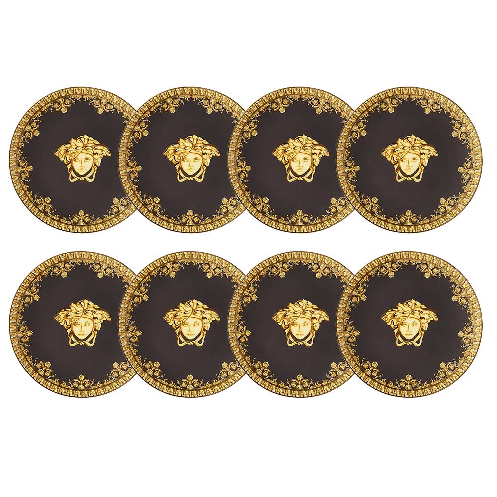 I Love Baroque-tallriken från Versace , gjord av fint porslin , är essensen av förfining och tidlös lyx . Den sofistikerade designen har en djupsvart bakgrund, berikad av en bård dekorerad med gyllene barockmotiv som förkroppsligar den konstnärliga traditionen i hus. I mitten dominerar Medusas ikoniska ansikte, en symbol för makt och evig charm, vilket ger en kunglig och distinkt karaktär åt detta mästerverk.