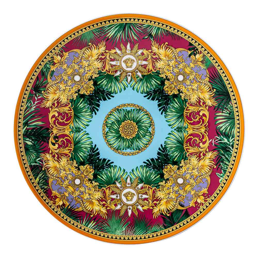 Djungeln Animalier bordstablett från Versace , i fint porslin , är en hyllning till exotism och lyx . Den extraordinära designen kombinerar en blandning av tropiska motiv , med frodiga löv, gyllene barockelement och den omisskännliga symbolen för Medusa , inställd i en skinande sol. De ljusa färgerna, som sträcker sig från djupgrönt till turkos, passerar genom rubinröda detaljer och gyllene accenter, skapar ett levande och fängslande konstverk.
