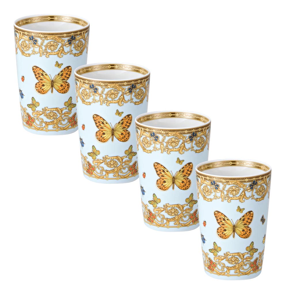 Detta Le Jardin de Versace- glas, tillverkat av raffinerat porslin , är en ode till skönhet och elegans. Dekorerad med ett barockt blommotiv och prydd med färgglada fjärilar , förkroppsligar den perfekt den omisskännliga stilen i Maison Versace. Den delikata blå bakgrundstonen, i kombination med de gyllene detaljerna , skapar en kombination av lyx och fräschör, perfekt för att berika varje bord med en touch av klass.