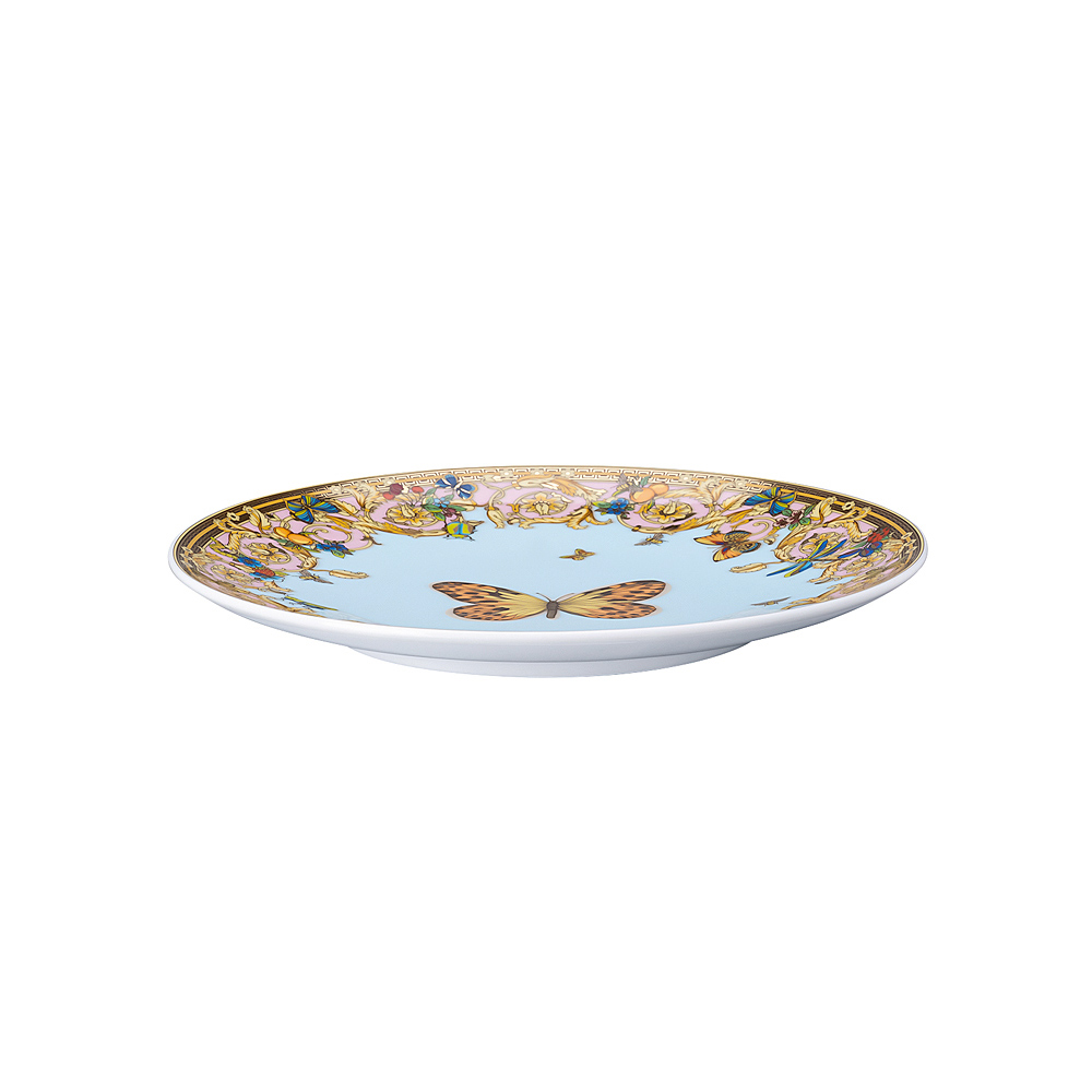 Denna charmiga porslinstallrik har en ljus och färgstark design som omedelbart fångar ögat, vilket gör den till en samlarpjäs såväl som en raffinerad servis. En elegant fjäril sticker ut i mitten, omgiven av en delikat prydnadsbård med blom- och arabeskmotiv, på en fridfull blå bakgrund.