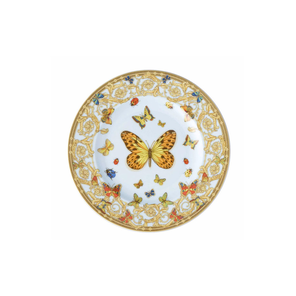Denna charmiga porslinstallrik har en ljus och färgstark design som omedelbart fångar ögat, vilket gör den till ett samlarobjekt såväl som en raffinerad servis. En elegant fjäril sticker ut i mitten, omgiven av en delikat prydnadsbård med blom- och arabeskmotiv.