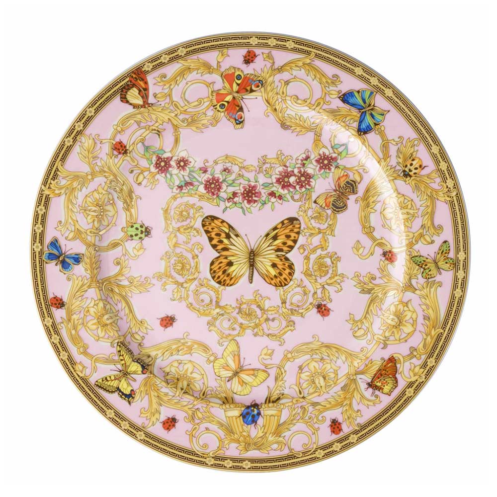 Denna magnifika porslinstallrik hyllar naturens skönhet med sin rika design av färgglada fjärilar och intrikata blommotiv, mot en förtjusande rosa bakgrund. Varje detalj är noggrant utformad, från de livfulla fjärilarna som ser ut att flyga från tallriken, till de känsliga blommorna och guldprydnaderna som ramar in och pryder designen.