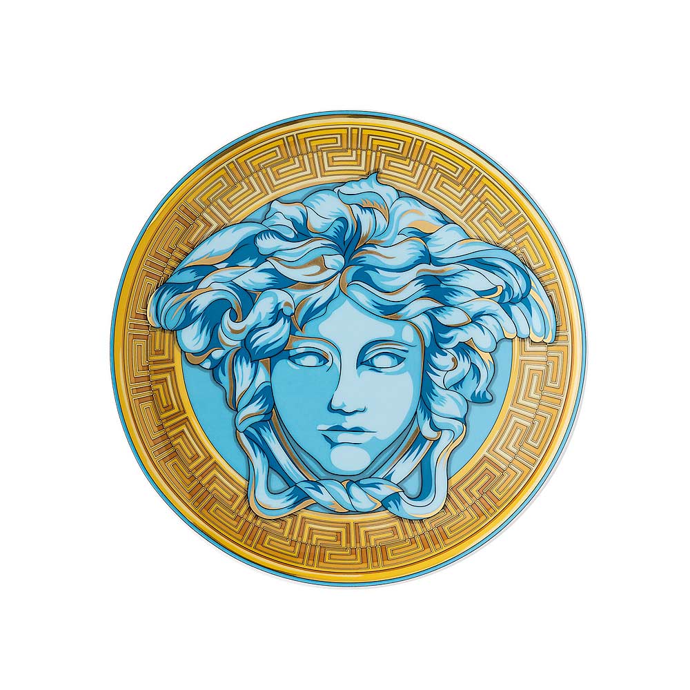 Versace Medusa Amplified Bread Plates , tillverkade av dyrbart porslin , förkroppsligar en perfekt balans mellan konst och modern lyx . Den djärva designen framhäver Medusas legendariska ansikte, den ikoniska symbolen för huset, omgiven av ett levande gyllene grekiskt motiv och delikata nyanser som ger en modern och raffinerad touch.