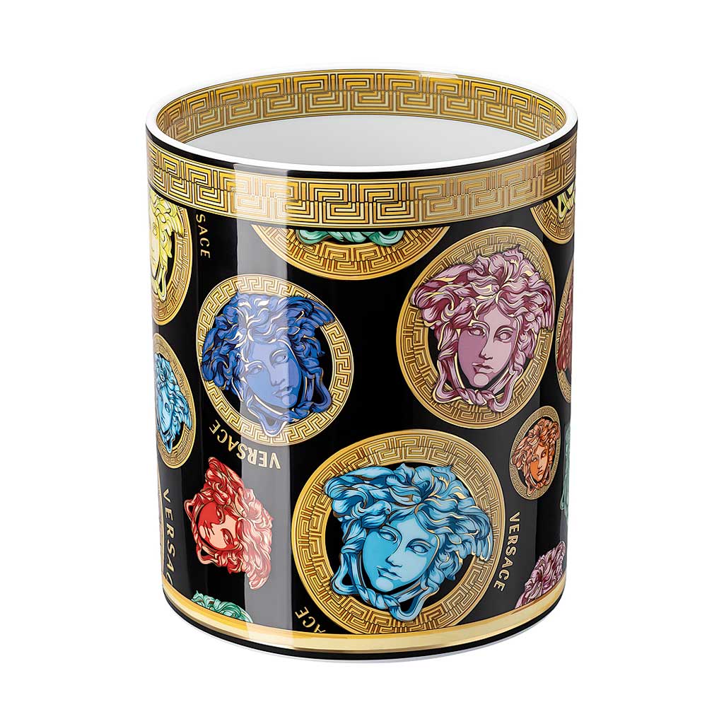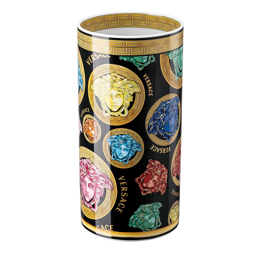 Medusa Amplified Multicolor-vasen från Versace , gjord av raffinerat porslin , är en riktig designjuvel. Dess fängslande motiv framhäver den ikoniska Medusa , omtolkad i en levande variation av färger som elegant sticker ut mot den glansiga svarta bakgrunden. Den övre ramen dekorerad med det klassiska gyllene grekiska motivet ger en touch av förfining och överflöd, vilket gör denna vas till ett verkligt konstverk.