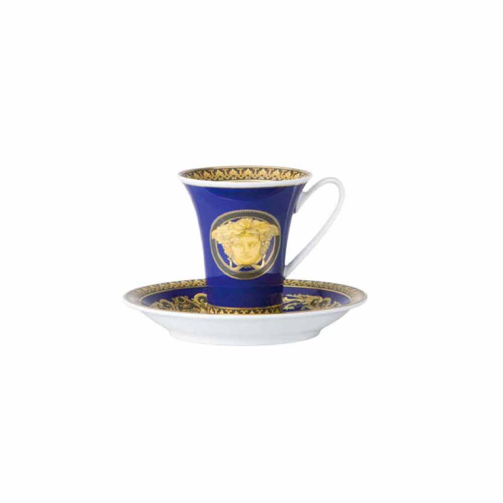 Den mycket stilfulla kaffekoppen och fatet från Versace är en del av den eleganta moderna kollektionen som i kombination med en fascinerande och raffinerad glamour påminner om tidigare epoker och uttrycks i den ljusa nyansen av blått och tar namnet Medusa Blue.